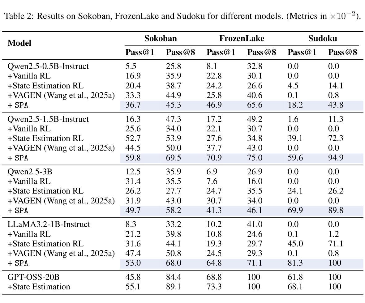 - 在多种环境下的实验表明SPA显著提高性能,如Sokoban成功率从25.6%提高到近六成,FrozenLake分数显著提高等。