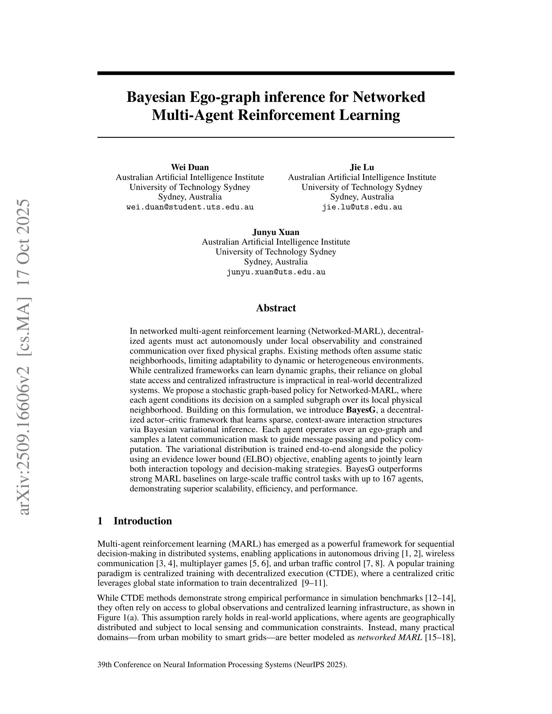 在网络化多智能体强化学习(Networked-MARL)中,去中心化的智能体必须在本地可观察性和固定物理图上的受限通信下行动。现有方法通常假设静态的邻居环境,这限制了其在动态或异构环境中的适应性。虽然集中式框架可以学习动态图,但它们对全局状态访问和集中式基础设施的依赖在现实世界中的去中心化系统中并不实用。我们提出了一种基于随机图的Networked-MARL策略,其中每个智能体在其局部物理邻居的采样子图基础上进行决策。在此基础上,我们引入了BayesG,这是一个去中心化的actor框架,通过贝叶斯变分推断学习稀疏的、上下文感知的互动结构。每个智能体在自我图上操作,并采样一个潜在的通信掩码来指导消息传递和策略计算。变分分布与策略一起使用证据下限(ELBO)目标进行端到端训练,使智能体能够联合学习交互拓扑和决策策略。在大型交通控制任务中,BayesG的表现超过了强大的MARL基准线,任务涉及多达167个智能体,显示了其出色的可扩展性、效率和性能。