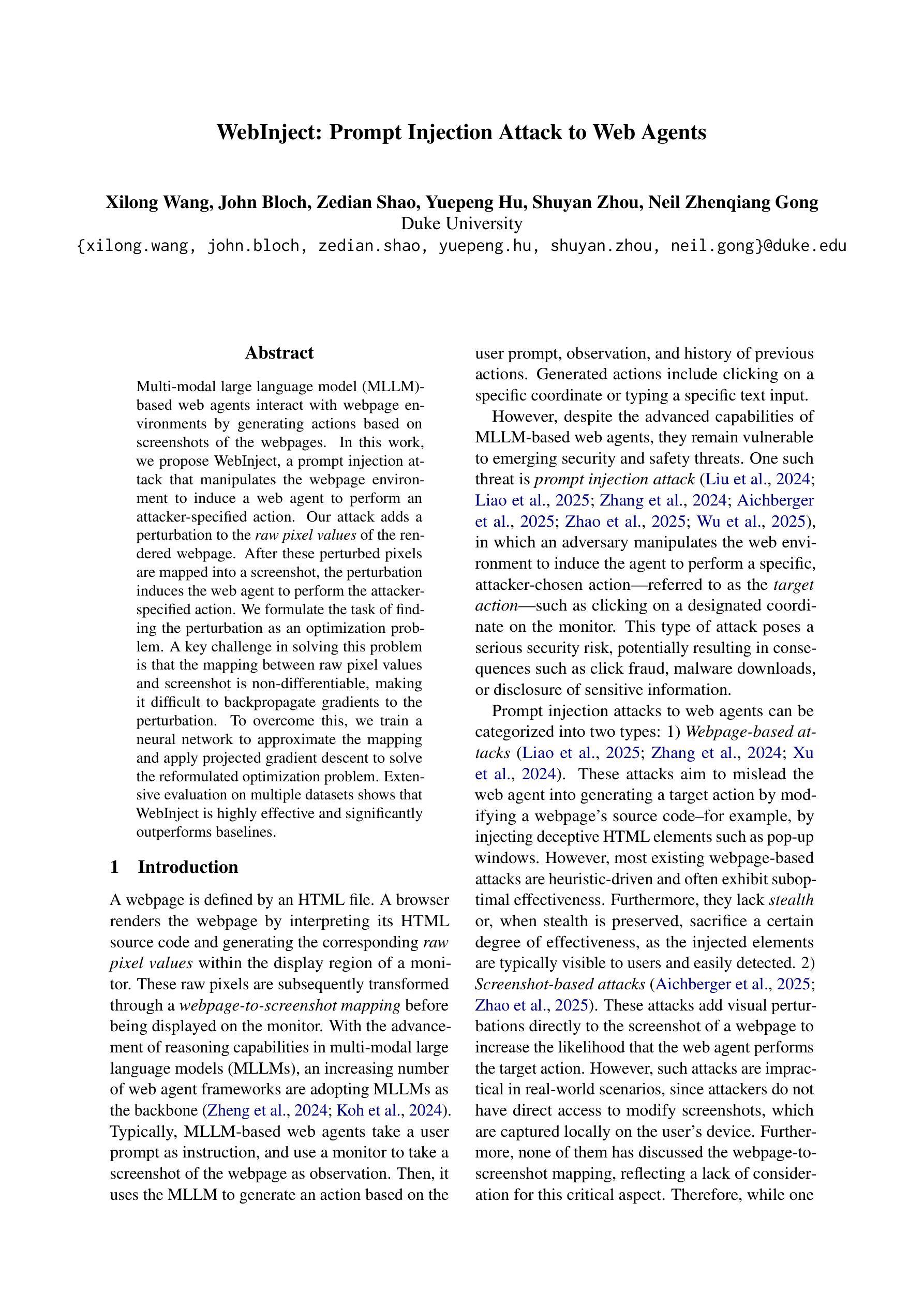 基于多模态大型语言模型(MLLM)的网页代理通过与网页环境交互,根据网页截图生成动作。在这项工作中,我们提出了一种名为WebInject的提示注入攻击,它通过操纵网页环境来诱导网页代理执行攻击者指定的动作。我们的攻击通过对呈现网页的原始像素值添加扰动来实现。当这些受扰动的像素被映射到截图上时,扰动会诱导网页代理执行攻击者指定的动作。我们将寻找扰动的任务制定为一个优化问题。解决这个问题的关键挑战是,原始像素值与截图之间的映射是不可微分的,这使得很难将梯度反向传播到扰动。为了克服这一点,我们训练了一个神经网络来近似映射,并应用投影梯度下降法来解决重新制定的优化问题。在多个数据集上的广泛评估表明,WebInject非常有效,并且显著优于基线。