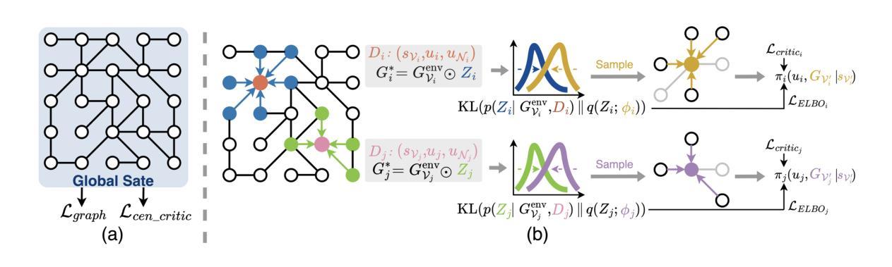 - 每个代理在自我图上运行,采样潜在通信掩码指导消息传递与策略计算。