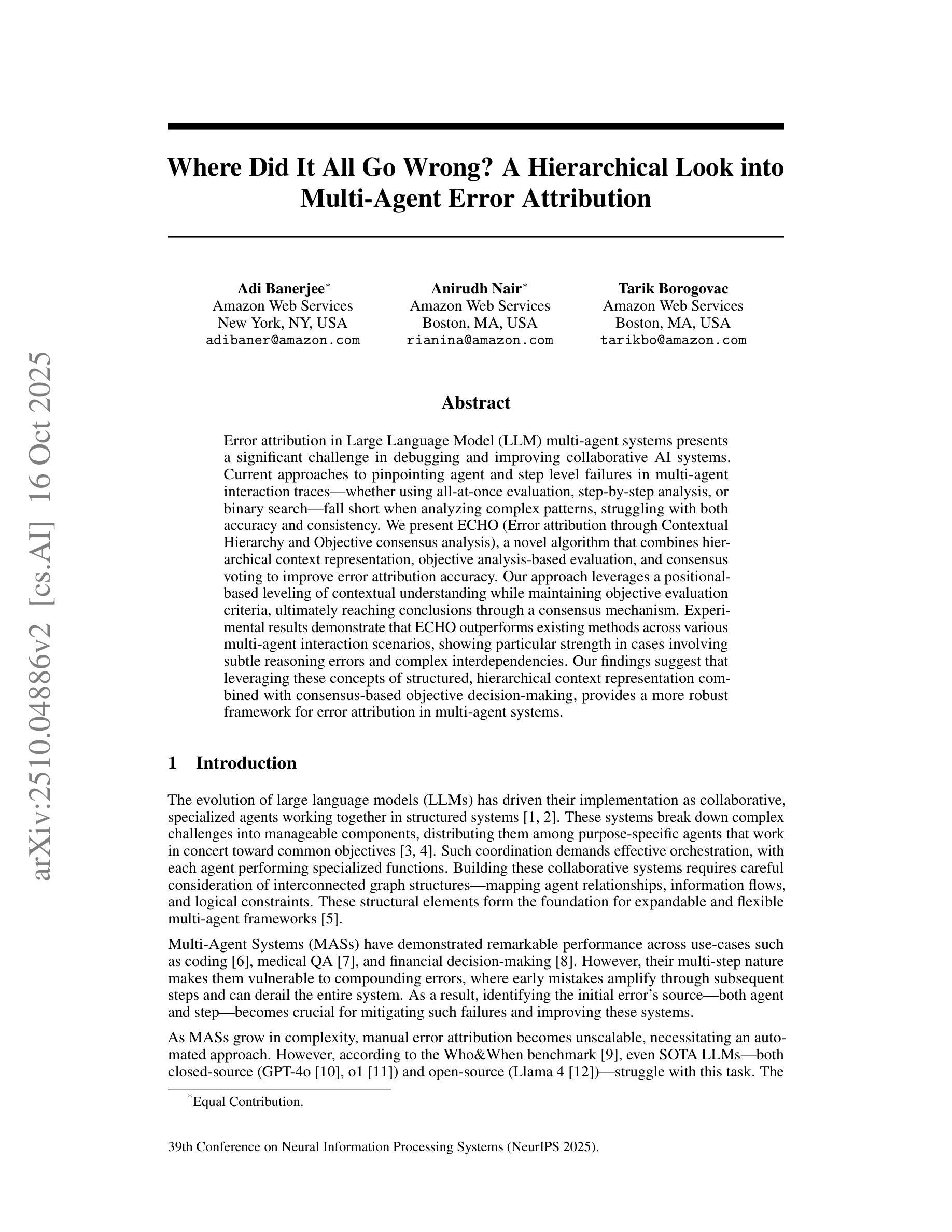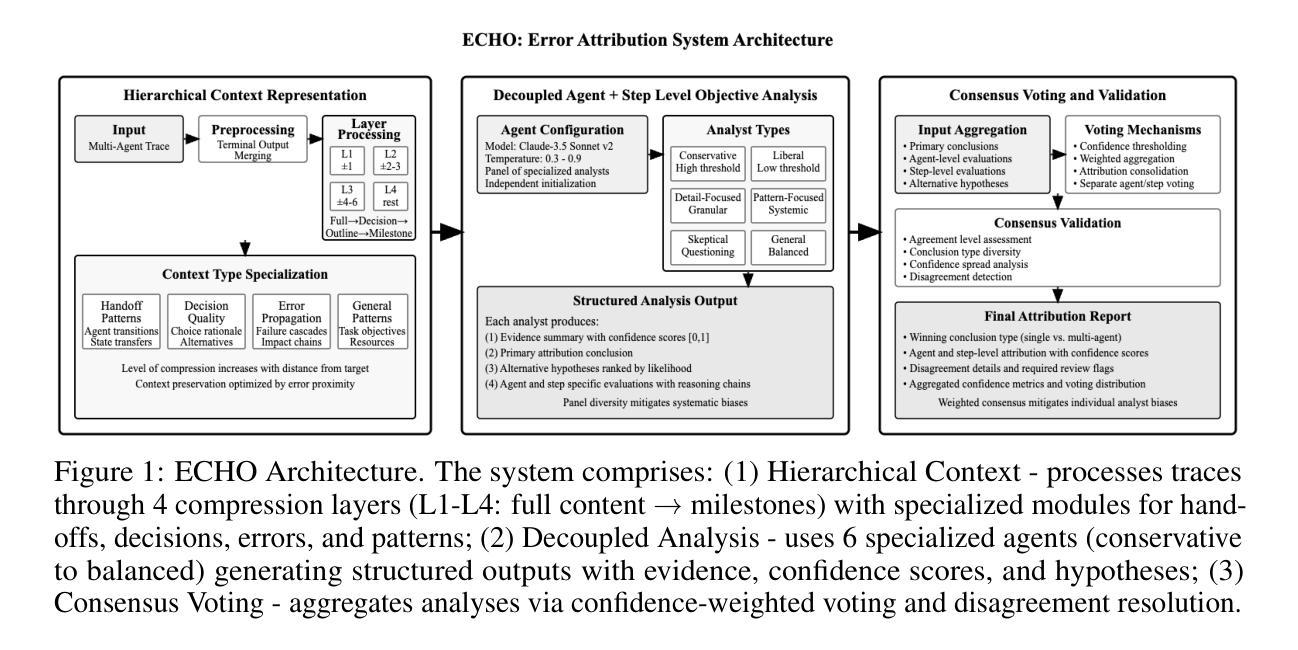 在大规模语言模型(LLM)多智能体系统中的错误归属在调试和改进协作人工智能系统时面临重大挑战。目前在交互跟踪中定位智能体和步骤级别失败的现有方法,无论是使用一次性评估、逐步分析还是二进制搜索,在分析复杂模式时都表现不足,准确性和一致性方面都存在困难。我们提出了ECHO(基于上下文层次和客观共识分析的错误归属),这是一种结合了层次化上下文表示、基于客观分析的评估和共识投票的新算法,以提高错误归属的准确性。我们的方法利用基于位置的上下文理解分级,同时保持客观的评价标准,最终通过共识机制得出结论。实验结果表明,ECHO在各种多智能体交互场景中表现优于现有方法,在涉及微妙推理错误和复杂相互依赖的情况下表现出特别的优势。我们的研究结果表明,利用结构化、层次化的上下文表示与基于共识的客观决策相结合的概念,为多智能体系统中的错误归属提供了更稳健的框架。