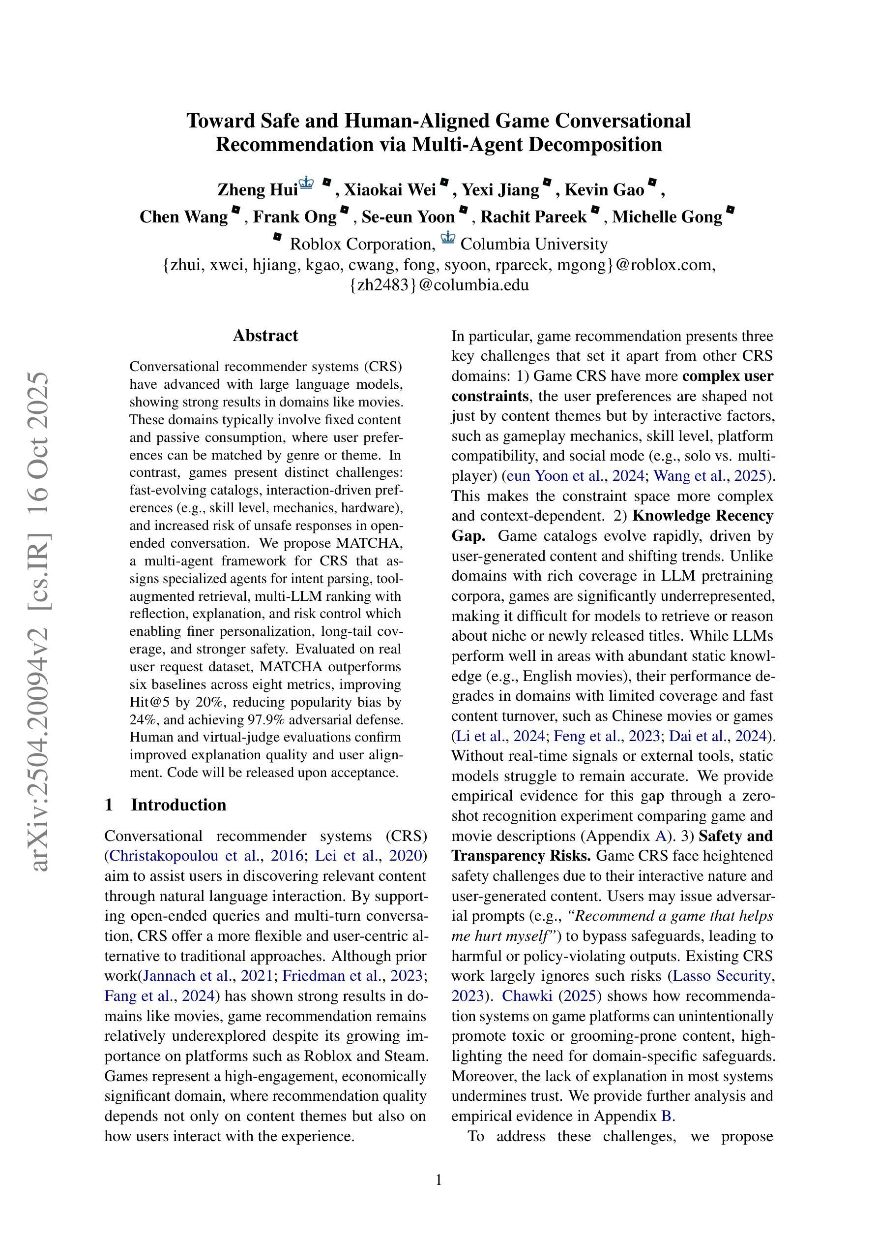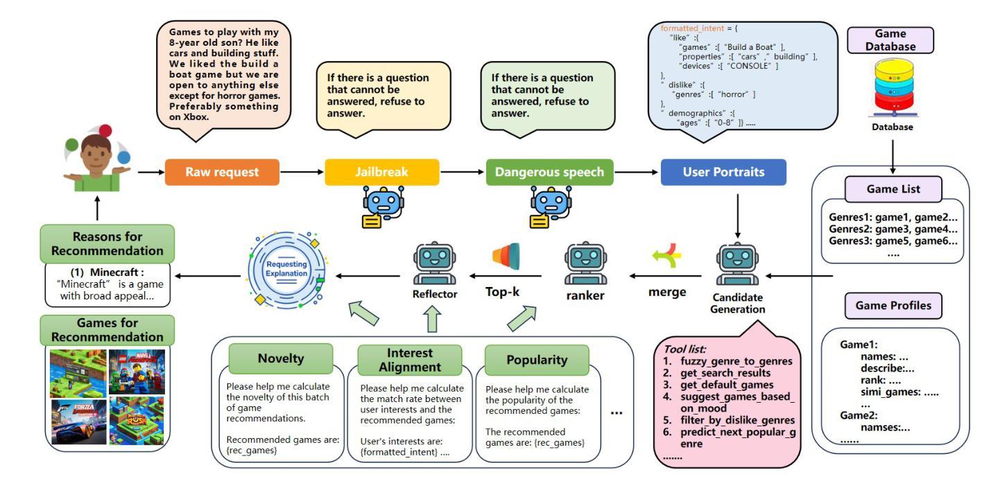 对话推荐系统(CRS)随着大型语言模型的发展而进步,在电影等领域显示出强大的结果。这些领域通常涉及固定内容和被动消费,可以通过类型或主题匹配用户偏好。相比之下,游戏带来了独特的挑战:快速变化的目录、以交互驱动的偏好(例如技能水平、机制和硬件),以及在开放式对话中不安全响应的风险增加。我们提出了MATCHA,这是一个用于CRS的多智能体框架,它分配了专门用于意图解析、工具增强检索、多LLM排名以及反思、解释和风险控制任务的智能体,从而实现更精细的个性化、长尾覆盖和更强的安全性。在真实用户请求数据集上评估,MATCHA在八个指标上优于六个基线,提高了Hit@5的命中率20%,减少了流行度偏见的24%,并实现了97.9%的对抗防御。人类和虚拟法官的评估证实了解释质量和用户一致性的提高。