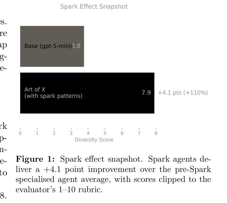 创意服务团队越来越多地依赖大型语言模型(LLM)来加速创意产生,然而生产系统往往会产生趋同的输出,无法满足品牌或艺术期望。Art of X开发了一种基于个性化条件的大型语言模型代理——“火花”,并通过角色启发系统提示库来实现实例化,以在多代理工作流程中有意使代理行为多样化。本白皮书记录了Spark代理计划的问题框架、实验设计和定量证据。通过使用以大型语言模型为法官的协议(以人类黄金标准校准),我们观察到当个性化条件的火花代理替换统一系统提示时,平均多样性增加了+4.1点(在1-10的范围内),与人类专家的差距缩小到1点。我们还介绍了评估者的偏见和未来部署的程序性考虑。