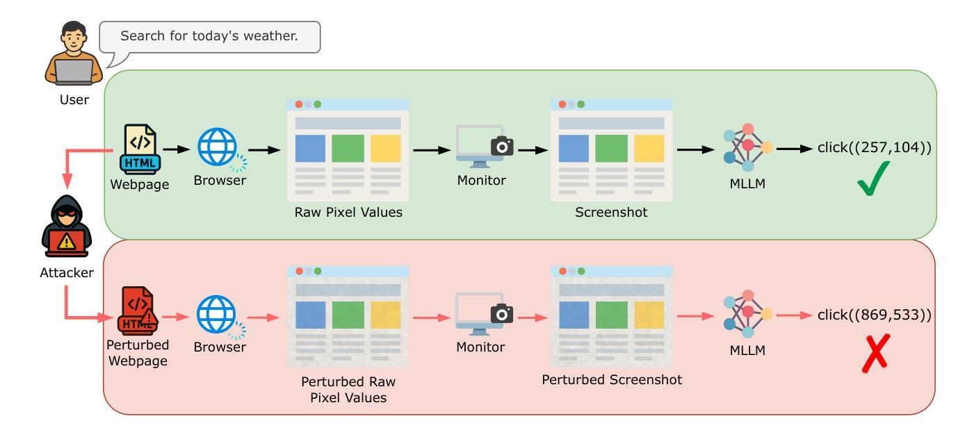 网页环境中的多模态大型语言模型(MLLM)通过基于网页截图的动作生成与网页进行交互。本研究提出了一种名为WebInject的提示注入攻击,它通过操纵网页环境来诱导网络代理执行攻击者指定的动作。该攻击通过对呈现网页的原始像素值添加扰动来实现。这些扰动后的像素被映射到截图后,会诱导网络代理执行攻击者指定的动作。我们把寻找扰动的问题作为一个优化问题来解决。解决这个问题的关键挑战是,原始像素值与截图之间的映射是不可区分的,使得难以将梯度反向传播到扰动上。为了克服这一点,我们训练了一个神经网络来近似映射,并应用投影梯度下降法来解决重新定义的优化问题。在多个数据集上的广泛评估表明,WebInject方法高度有效且明显优于基线方法。