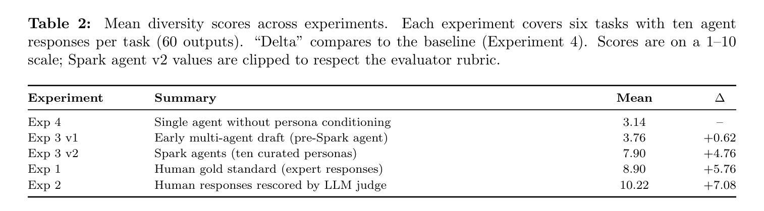 - 实验表明,使用“Spark”代理替换统一系统提示后,平均多样性增加4.1分。