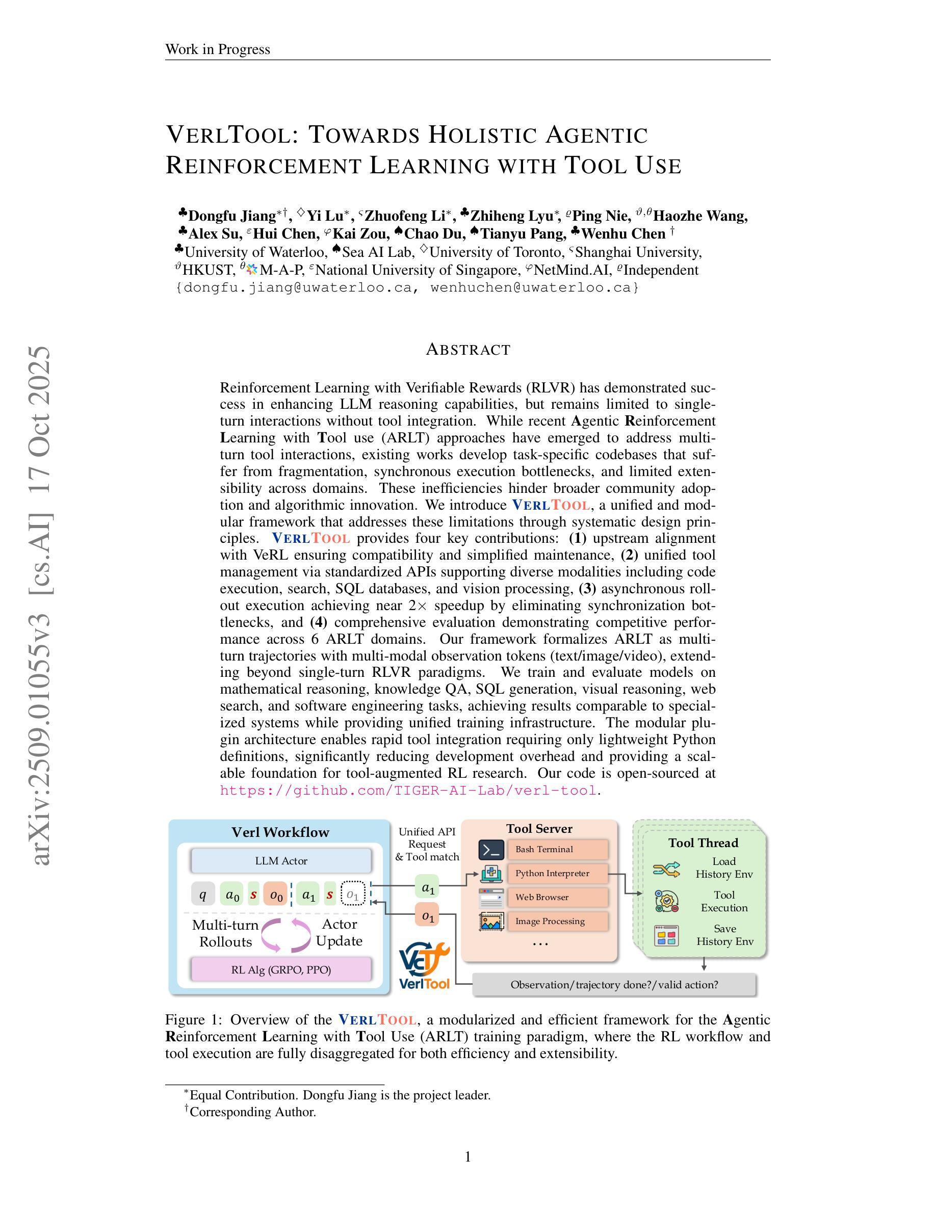 强化学习与可验证奖励(RLVR)已成功提高了大型语言模型的推理能力,但仍局限于没有工具集成的单轮交互。虽然最近出现了工具使用强化学习(ARLT)的方法来解决多轮工具交互问题,但现有工作开发了任务特定的代码库,存在碎片化、同步执行瓶颈和跨域扩展性有限等不足。这些效率问题阻碍了更广泛的社区采纳和算法创新。我们引入了VerlTool,这是一个通过系统设计原则解决这些限制的统一模块化框架。VerlTool提供了四个关键贡献:(1)与VeRL上游对齐,确保兼容性并简化维护;(2)通过支持多种模式(包括代码执行、搜索、SQL数据库和视觉处理)的标准API进行统一工具管理;(3)通过消除同步瓶颈实现近2倍的异步回滚执行加速;(4)综合评估在6个ARLT领域展示具有竞争力的性能。我们的框架将ARLT形式化为多轮轨迹,具有多模态观察令牌(文本/图像/视频),超越了单轮RLVR范式。我们在数学推理、知识问答、SQL生成、视觉推理、网络搜索和软件工程任务上对模型进行训练和评估,在提供统一训练基础设施的同时,实现了与专用系统相当的结果。模块化插件架构使得快速工具集成只需要轻量级的Python定义,显著减少了开发开销,并为工具增强型强化学习研究提供了可扩展的基础。我们的代码已公开在https://github.com/TIGER-AI-Lab/verl-tool。