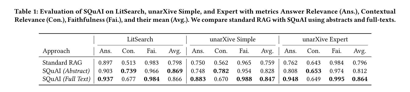 - SQuAI在忠实度、答案相关性和上下文相关性方面较基线有显著改善。