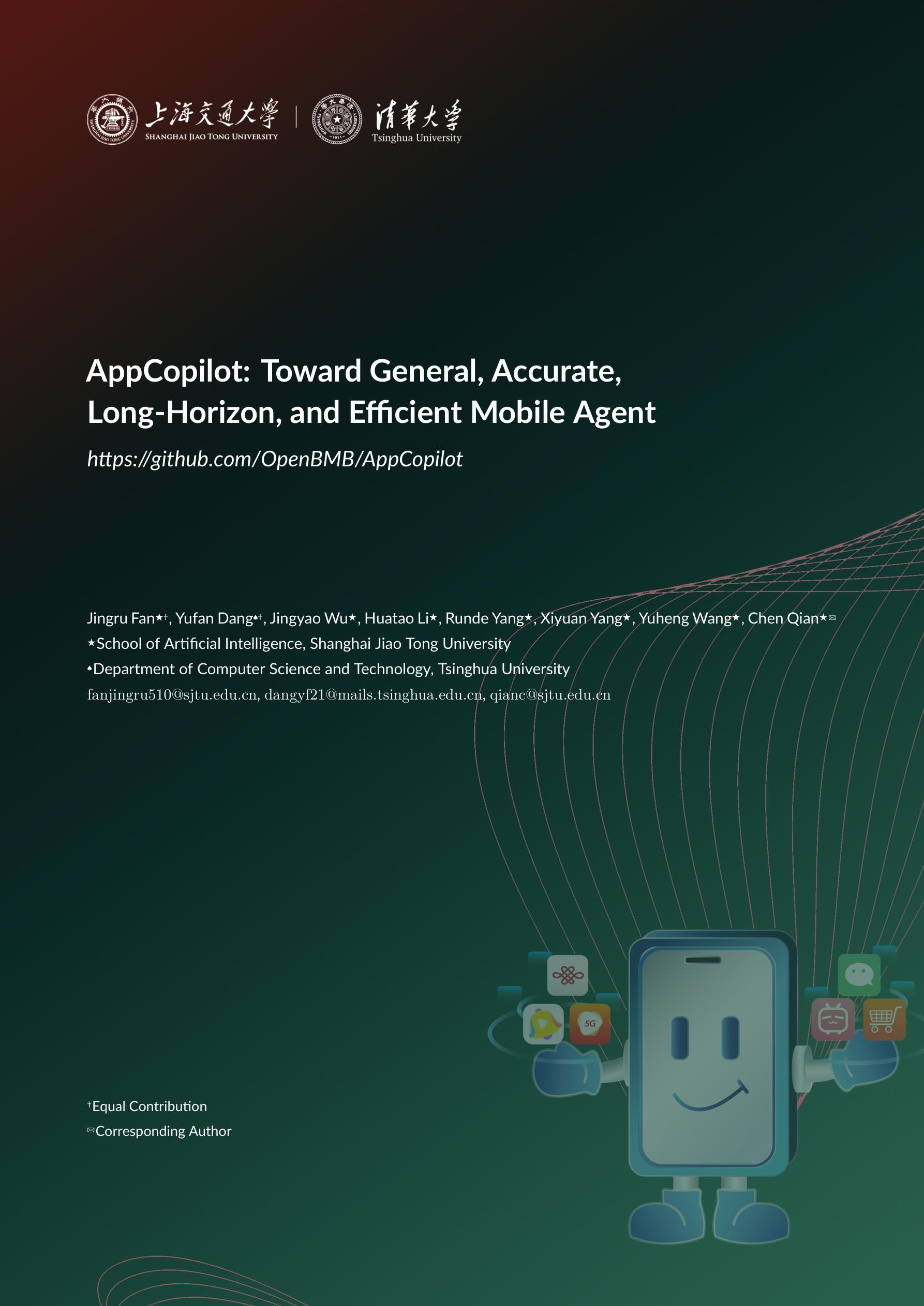 随着大型语言模型和跨模态模型的飞速发展,移动代理景观呈现出多样化趋势,但尚未在基础挑战上达成共识。本文确定了移动代理要解决的四个核心问题,以实现实际和可扩展的影响:(1)跨任务、APP和设备进行推广;(2)准确性,特别是精确的屏幕交互和点击定位;(3)长期能力以实现持续的多步目标;(4)效率,特别是在资源受限设备上的高性能运行时。我们提出了AppCopilot,这是一个跨应用程序的多模态、多代理、通用移动代理。AppCopilot通过贯穿数据采集、训练、微调、高效推理和PC/移动应用的全端管道来实施这一立场。在模型层,它融合了多模态基础模型,支持稳健的中英文。在推理和控制层,它结合了思维链推理、层次任务规划和分解以及多代理协作。在执行层,它实现了体验式适应、语音交互、函数调用、跨APP和跨设备编排以及全面的移动APP支持。系统设计采用基于性能剖析的优化方法,以降低异构硬件的延迟和内存消耗。经验表明,AppCopilot在四个维度上取得了显著改进:更强的泛化能力、更高的屏幕操作精度、更可靠的长周期任务完成率以及更快、更省资源的运行时表现。本文通过明确一致的观点和参考架构,从数据采集、训练到微调和高效推理,为通用移动代理提供了具体路线图和实践指导。