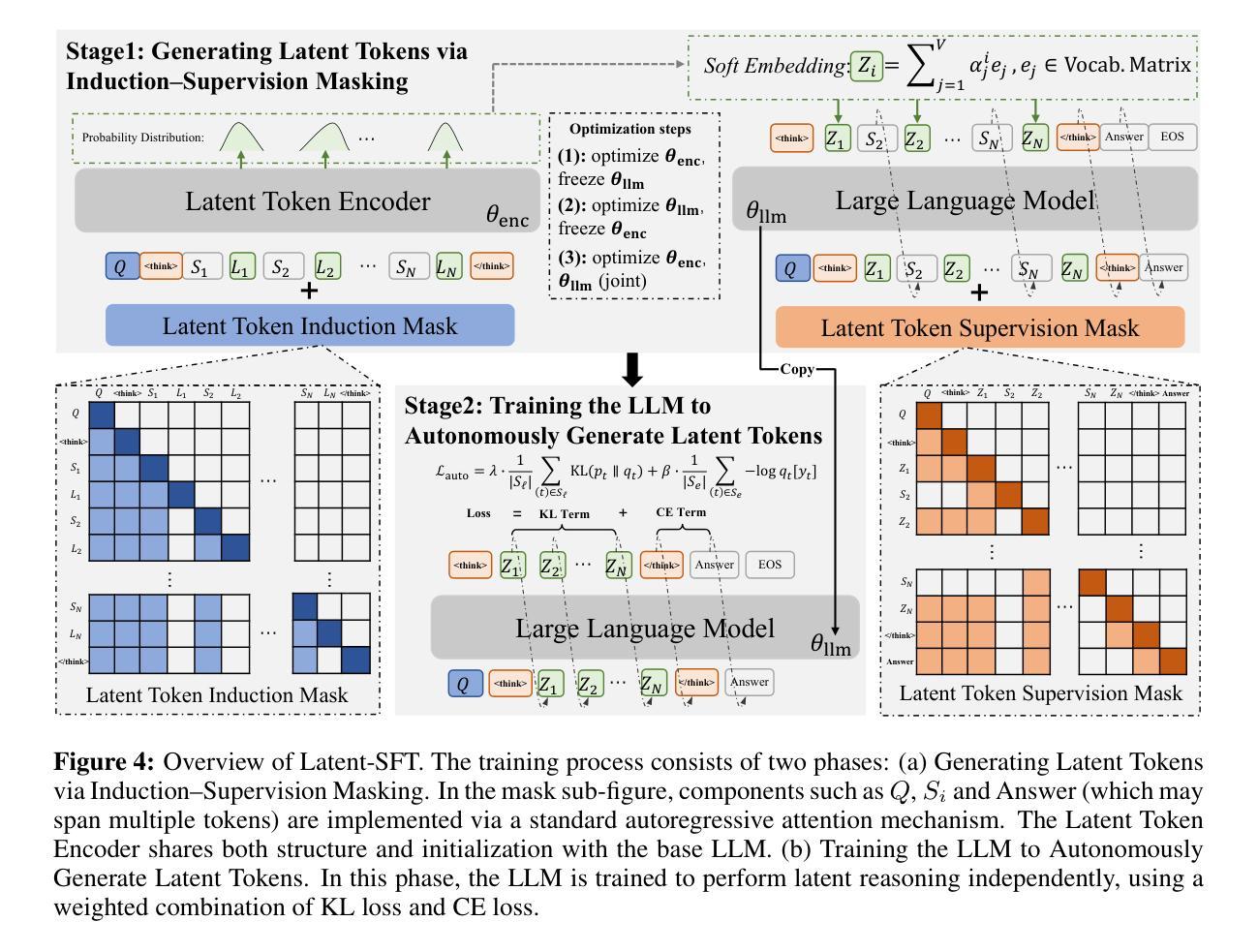 - 引入Latent-SFT两阶段学习框架来指导生成潜在令牌并训练LLM自主进行潜在推理。