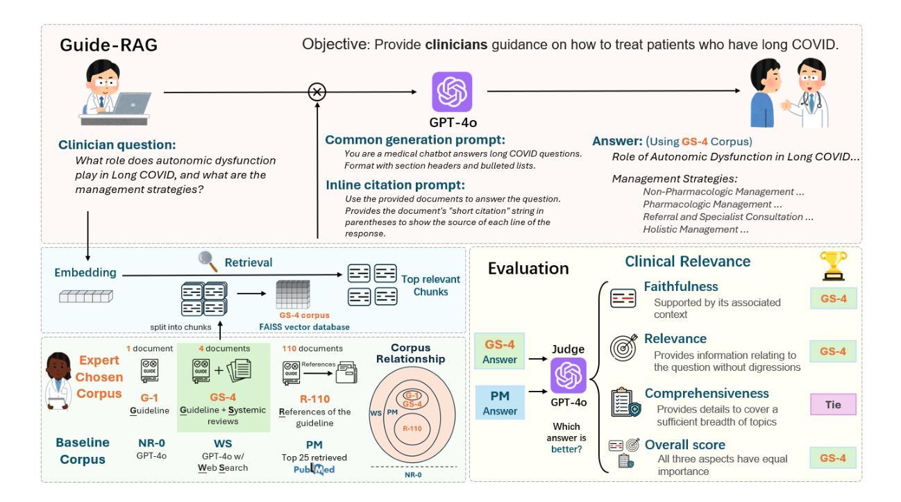 随着人工智能聊天机器人在临床医学中的应用越来越广泛,针对新兴复杂疾病开发有效的框架面临重大挑战。我们为Long COVID(LC)的临床问答开发了六种检索增强生成(RAG)语料库配置,从专家精心挑选的源到大规模文献数据库不等。我们的评估使用了一种大型语言模型作为法官的框架,根据忠实度、相关性和全面性的指标,并利用专家生成的临床问题新型数据集LongCOVID-CQ进行评价。我们的RAG语料库配置结合了临床指南和高质量的系统评价,持续优于狭隘的单指南方法和大规模文献数据库。我们的研究结果表明,对于新兴疾病而言,基于精选二次评价的检索在狭窄共识文件和未筛选的一次文献之间提供了最佳平衡,既支持临床决策制定,又避免了信息过载和过于简化的指导。我们提出了Guide-RAG这一聊天机器人系统及其评估框架,融合了精选的专家知识和全面的文献数据库,能够有效地回答LC的临床问题。