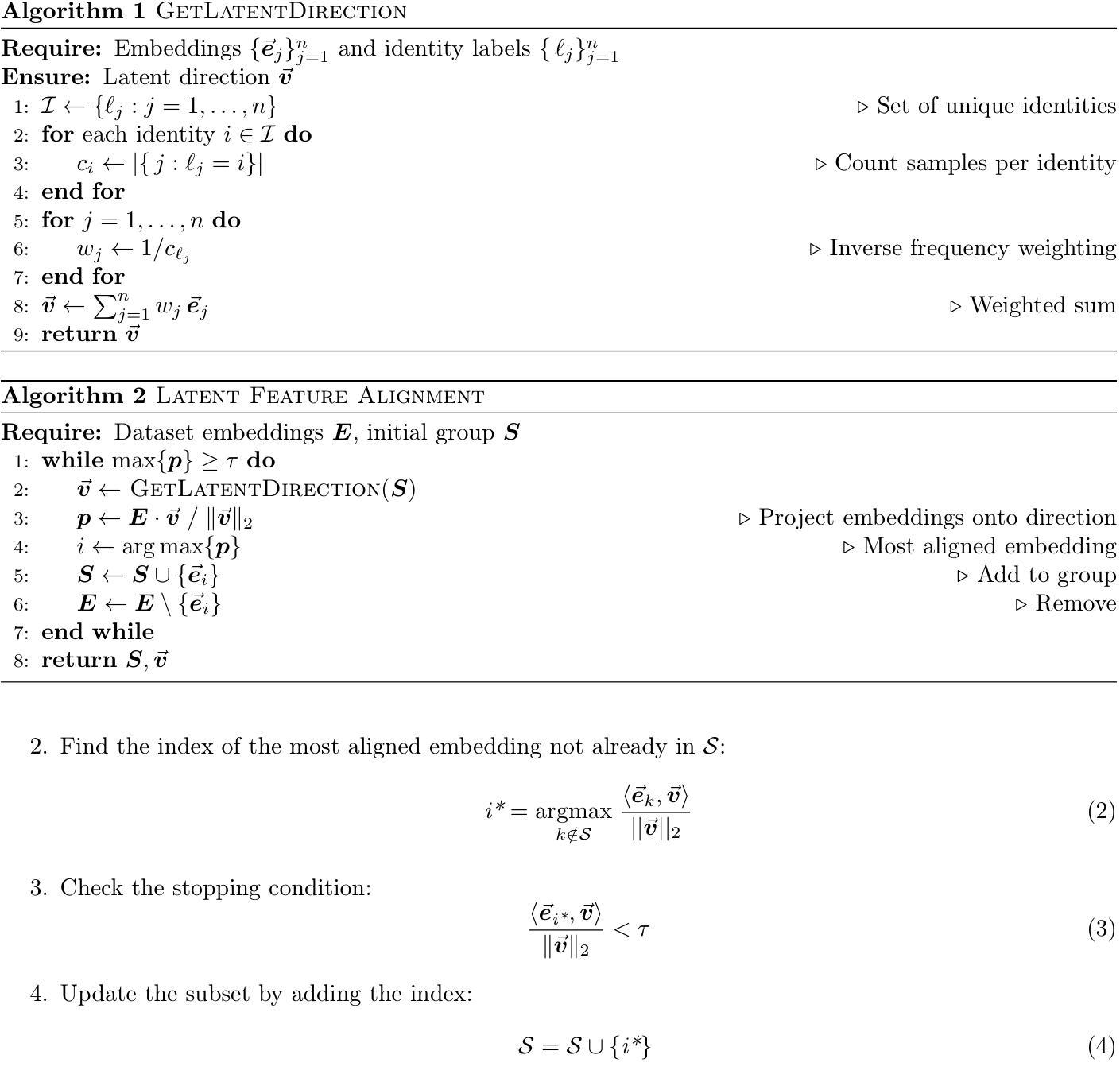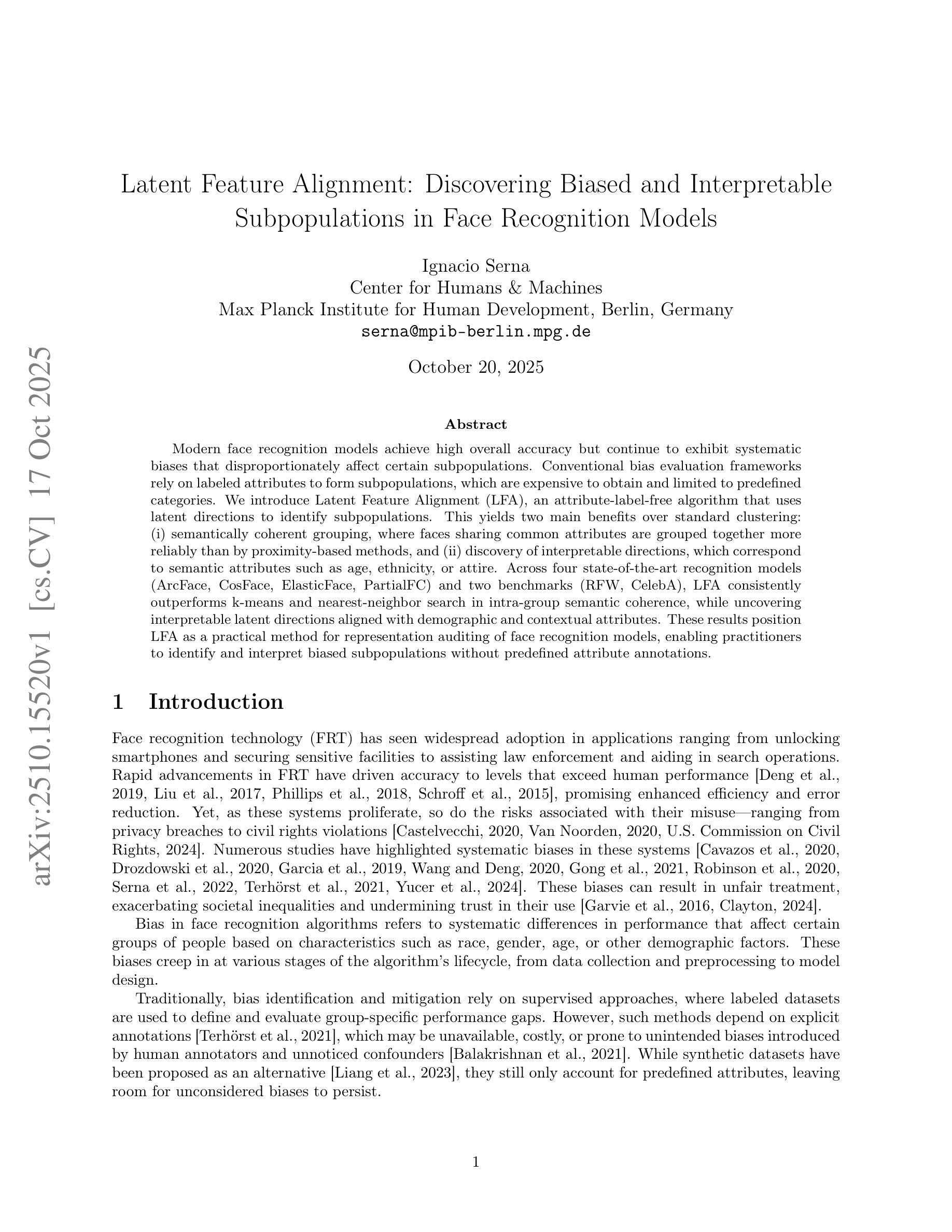 现代人脸识别模型虽然总体上具有很高的准确性,但仍然存在系统偏见,对某些特定群体造成不公平的影响。传统的偏见评估框架依赖于标签属性来形成子群体,这些标签属性的获取成本高昂且仅限于预定义的类别。我们引入了潜在特征对齐(LFA)算法,这是一种无需属性标签的算法,它通过潜在方向来识别子群体。这相对于标准聚类方法带来了两个主要优势:(i)语义连贯的分组,其中共享共同属性的面孔比基于邻近度的方法更可靠地组合在一起;(ii)发现可解释的潜在方向,这些方向对应于年龄、种族或服饰等语义属性。在四种最新的人脸识别模型(ArcFace、CosFace、ElasticFace、PartialFC)和两个基准测试(RFW、CelebA)上,LFA在组内语义一致性方面始终优于K均值和最近邻搜索,同时揭示了与人口统计和上下文属性相对应的可解释的潜在方向。这些结果使LFA成为人脸识别模型表示审计的实用方法,使从业者能够识别和解释存在偏见的子群体,无需预先定义的属性注释。