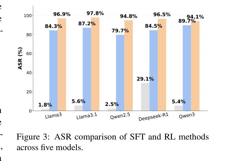 - 基于RLVR的攻击使模型易于遵循有害指令,攻击成功率高。