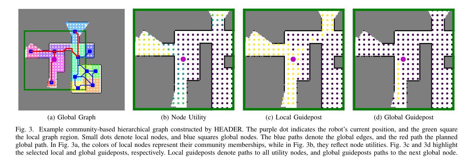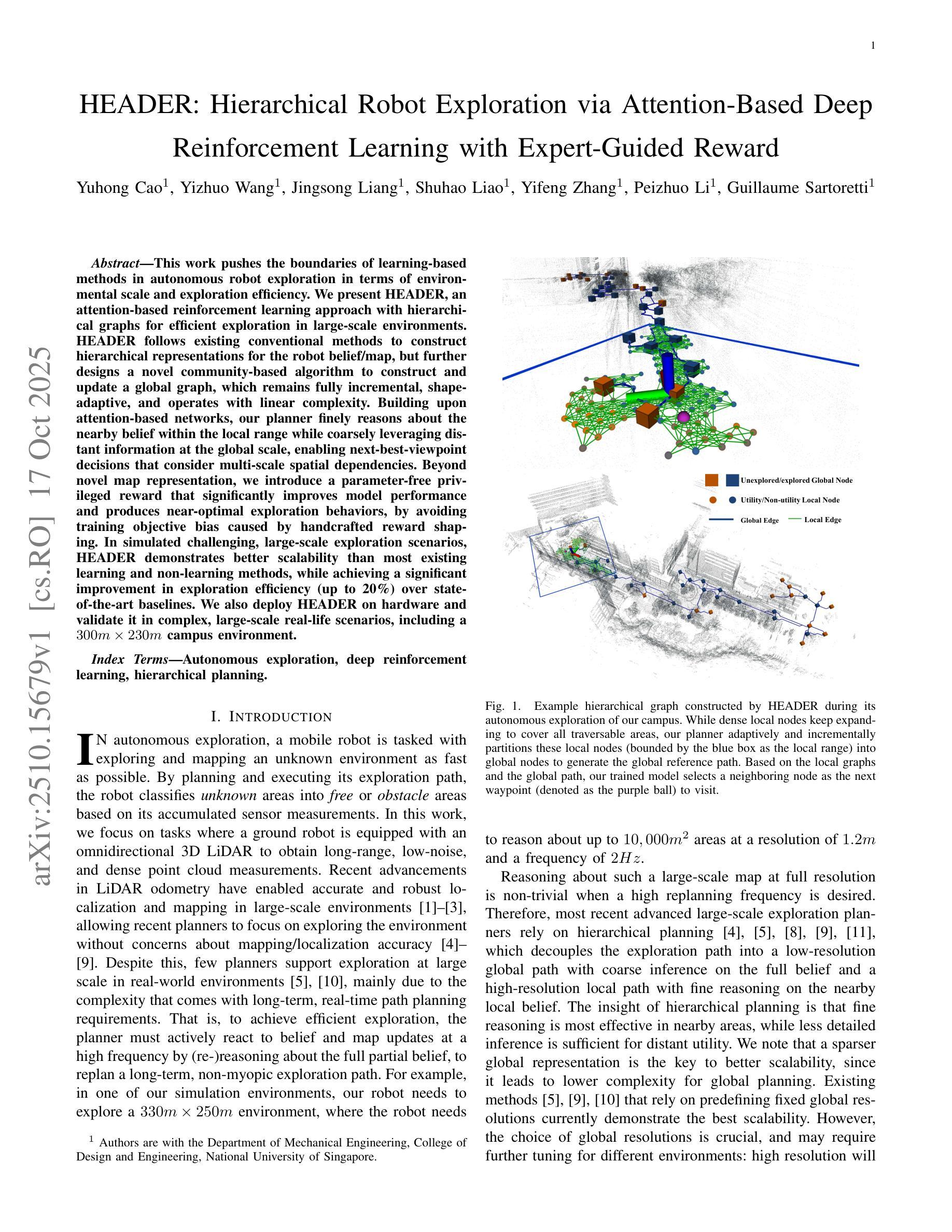 本文在环境规模和探索效率方面推动了基于学习的自主机器人探索方法的边界。我们提出了HEADER,这是一种基于注意力机制的强化学习方法,使用分层图进行大规模环境中的高效探索。HEADER遵循现有的传统方法为机器人的信念/地图构建分层表示,但进一步设计了一种基于社区的新算法来构建和更新全局图,该算法保持完全增量、形状自适应,并以线性复杂度运行。我们的规划器基于注意力网络,能够精细推理局部范围内的附近信念,同时粗略利用全局尺度上的远距离信息,从而能够考虑多尺度空间依赖性的下一个最佳视点决策。除了新的地图表示之外,我们还引入了一种无参数的特权奖励,该奖励显著提高了模型性能,并产生了接近最优的探索行为,避免了由于手工奖励形状造成的训练目标偏见。在模拟的具有挑战性、大规模的探索场景中,HEADER展示了比大多数现有的学习和非学习方法更好的可扩展性,同时在探索效率上实现了对最新技术的显著改善(高达20%)。我们还部署了HEADER在硬件上并在复杂的大规模真实场景中进行了验证,包括一个300米* 230米的校园环境。