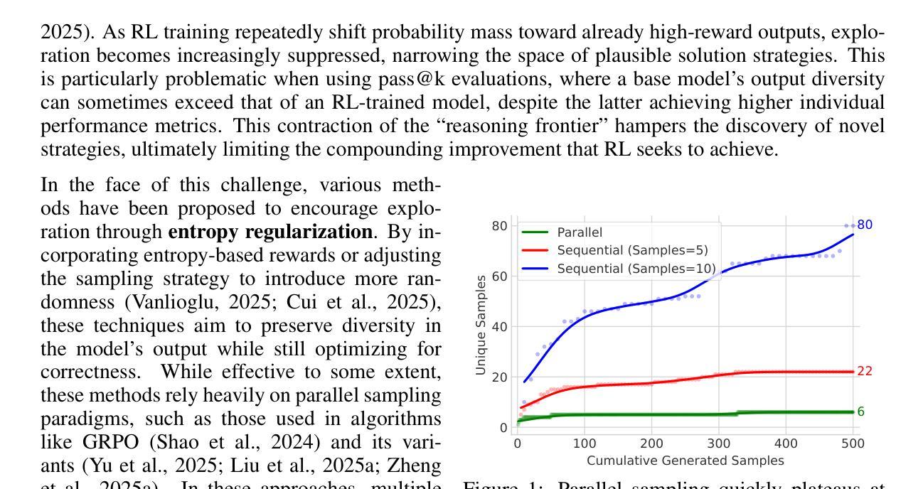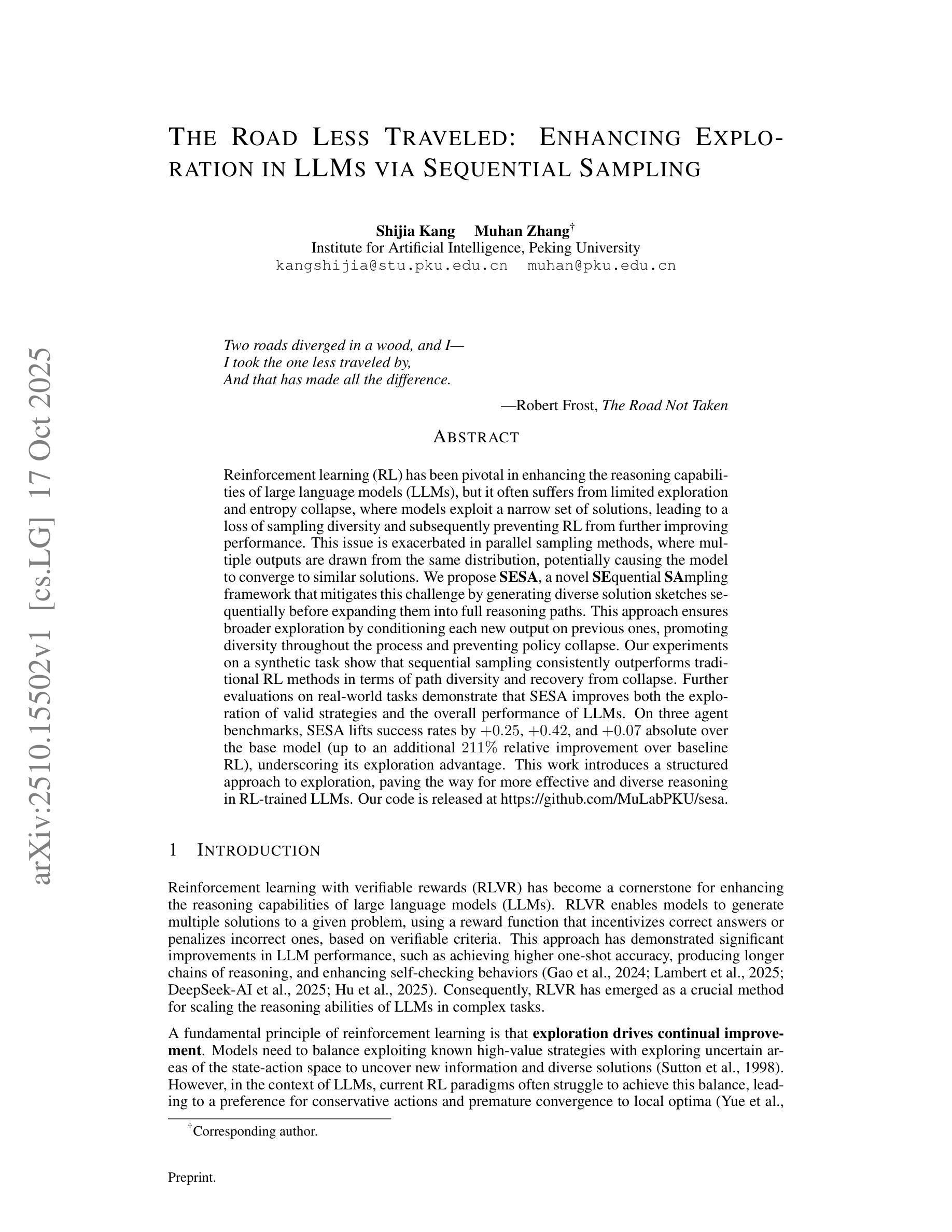 强化学习(RL)在提升大型语言模型(LLM)的推理能力方面发挥着至关重要的作用,但往往受到探索有限和熵崩溃的限制,模型会利用一组有限的解决方案,导致采样多样性丧失,从而阻碍RL进一步提高性能。在并行采样方法中,这个问题更加严重,因为从同一分布中抽取多个输出可能导致模型收敛到相似的解决方案。我们提出了SESA,这是一种新型的SEquential SAmpling框架,通过按顺序生成不同的解决方案草图,然后再将其扩展为完整的推理路径,从而缓解这一挑战。这种方法通过使每个新输出依赖于前一个输出,确保更广泛的探索,促进过程中的多样性,并防止策略崩溃。我们在合成任务上的实验表明,在路径多样性和从崩溃中恢复方面,顺序采样始终优于传统RL方法。在现实任务上的进一步评估表明,SESA提高了有效策略的探索以及LLM的总体性能。在三个代理基准测试中,SESA在基础模型上绝对提高了+0.25,+0.42和+0.07的成功率(相对于基线RL,最高达到额外的211%的相对改进),突显了其探索优势。这项工作引入了结构化探索方法,为RL训练LLM中更有效和多样化的推理铺平了道路。我们的代码发布在https://github.com/MuLabPKU/sesa。