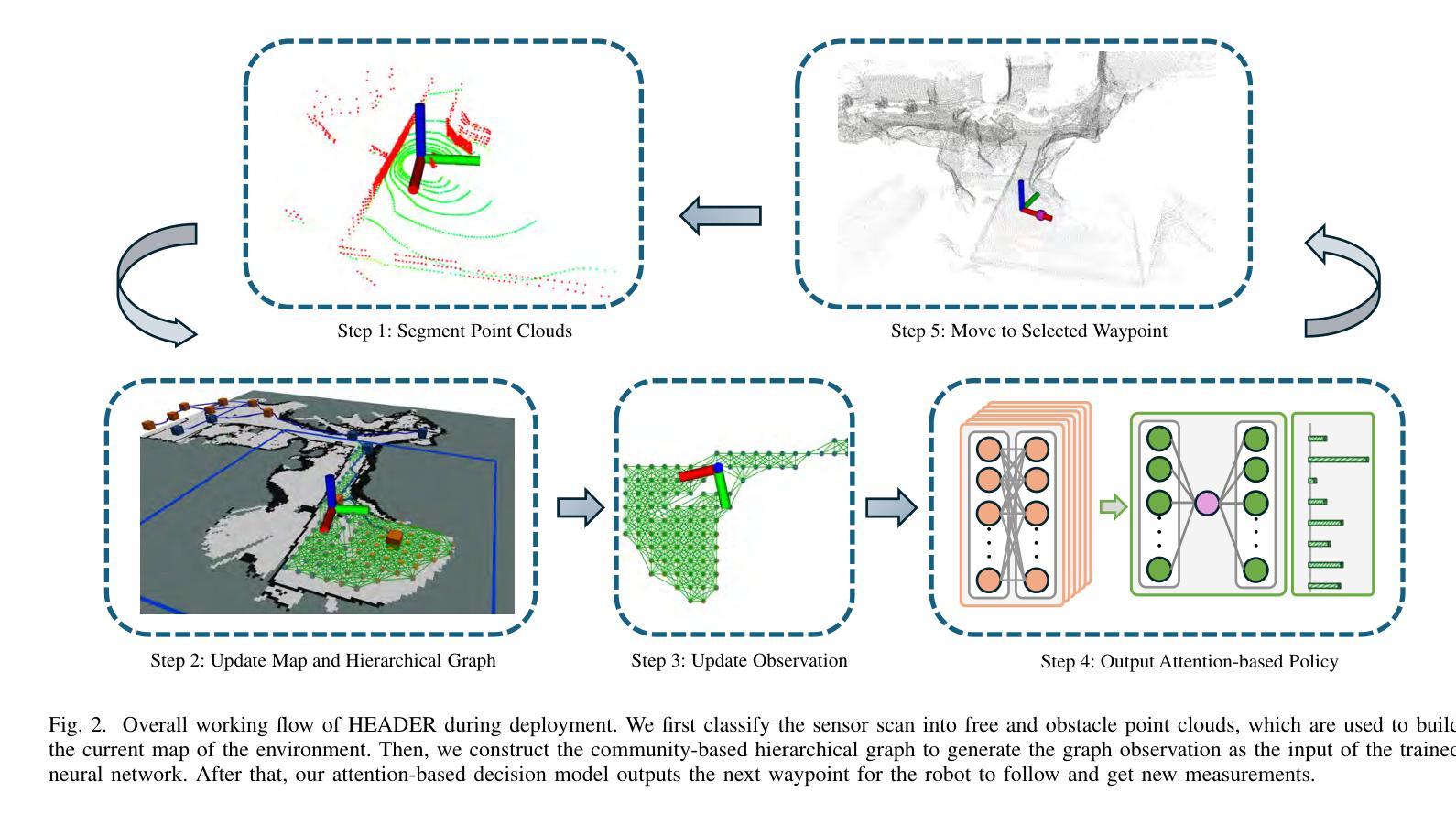 - HEADER是一种基于注意力强化学习的方法,用于大规模环境中的机器人自主探索。