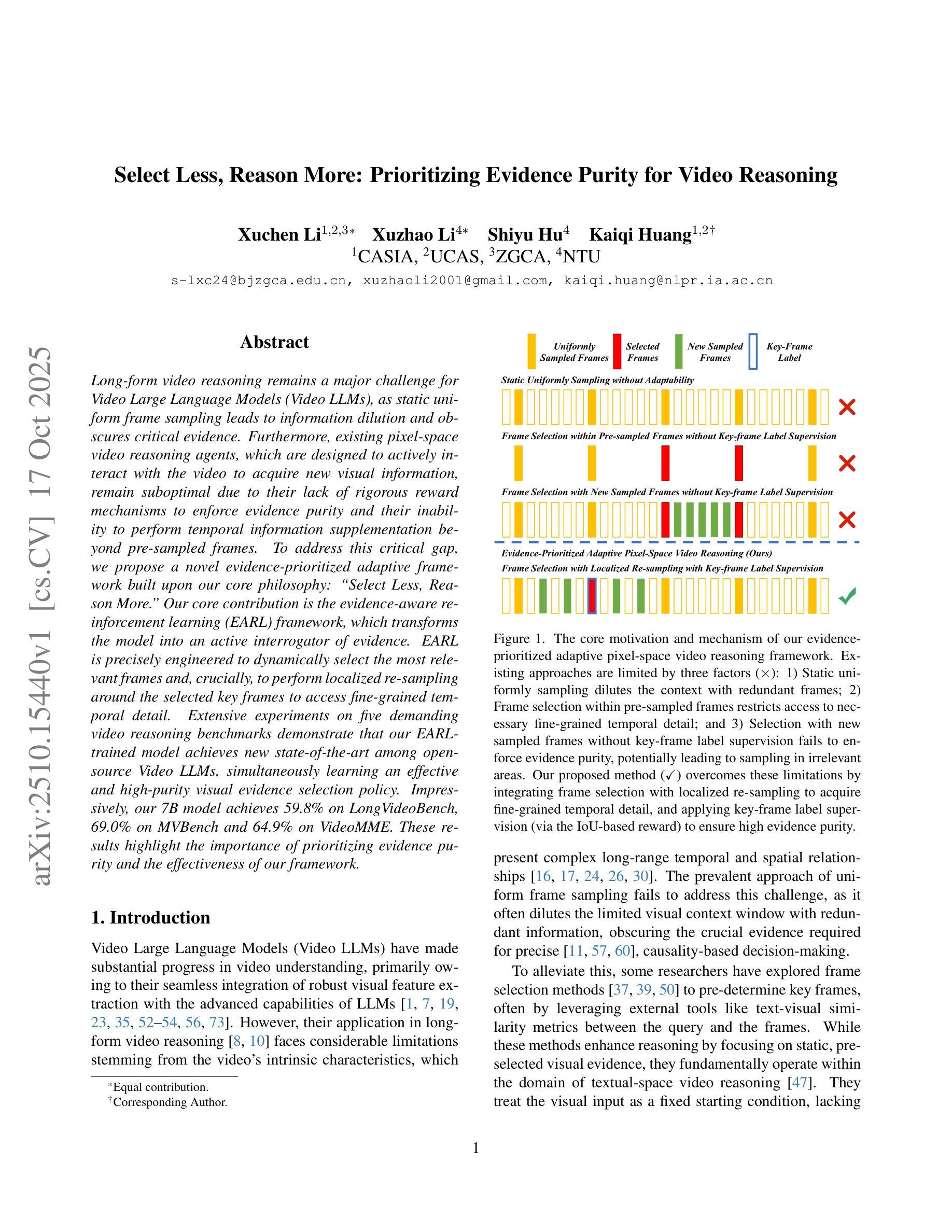 本文介绍了针对视频大型语言模型(Video LLMs)在处理长视频推理时面临的挑战,提出一种新型的证据优先自适应框架,通过证据感知强化学习(EARL)实现模型对证据的主动询问。该框架能够动态选择最相关的帧,并在选定的关键帧周围进行局部重新采样,以获取精细的时间细节。实验结果表明,该框架在五个视频推理基准测试上达到了最新水平,同时学习了有效的高纯度视觉证据选择策略。