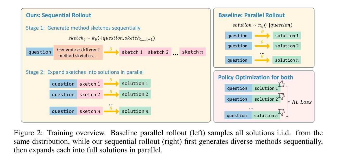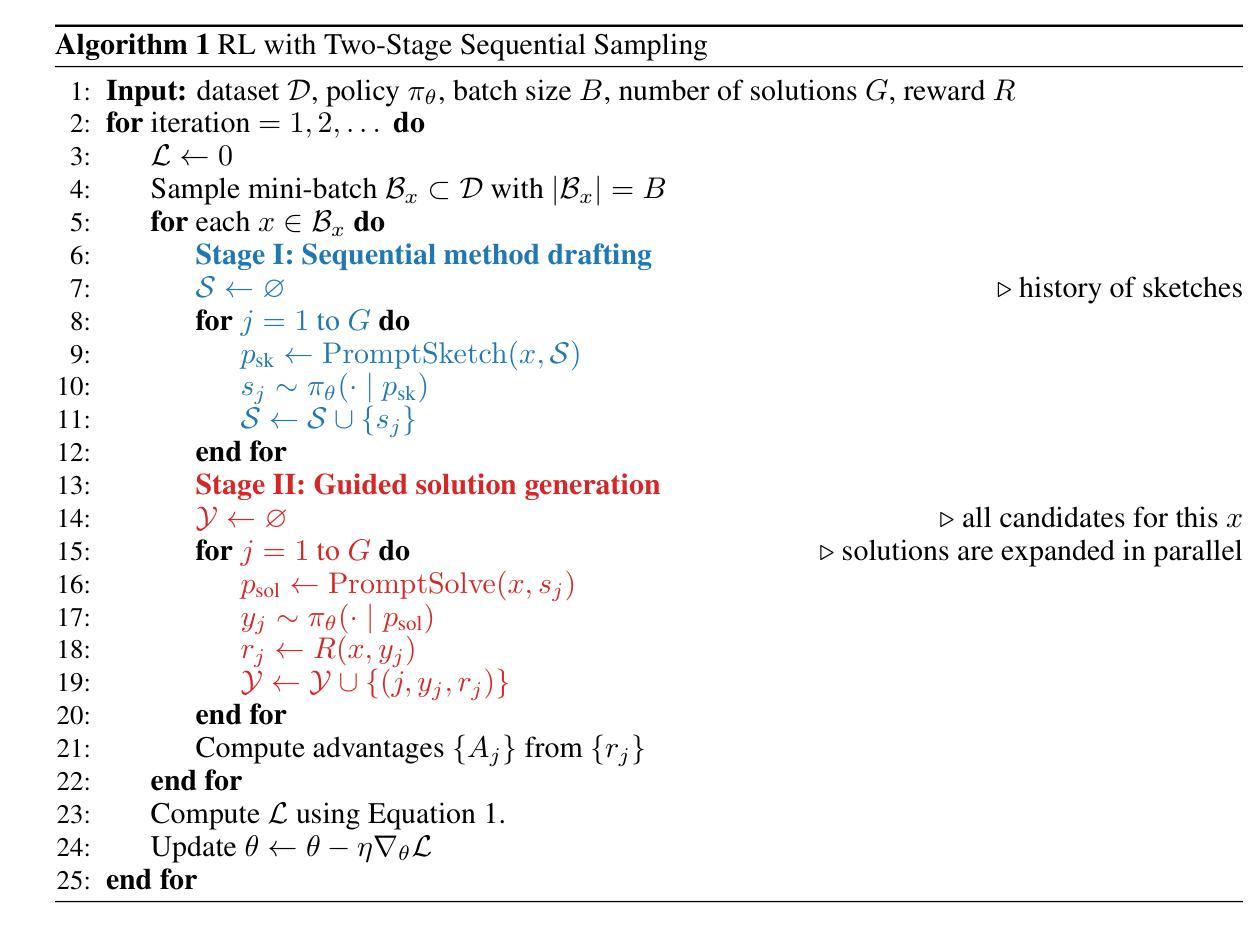 强化学习(RL)在提高大型语言模型(LLM)的推理能力方面起着至关重要的作用,但存在探索有限和熵崩溃的问题。针对这一问题,我们提出了SESA,一种新型的SEquential SAmpling框架,通过顺序生成多样的解决方案草图,再扩展成完整的推理路径,解决了这个问题。实验表明,该框架在路径多样性和防止策略崩溃方面表现优越。该工作在RL训练的LLM中引入结构化探索方法,显著提升模型性能。