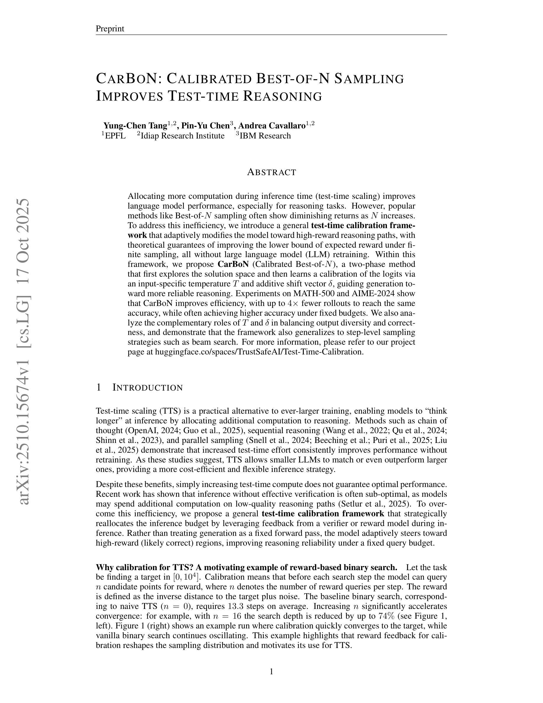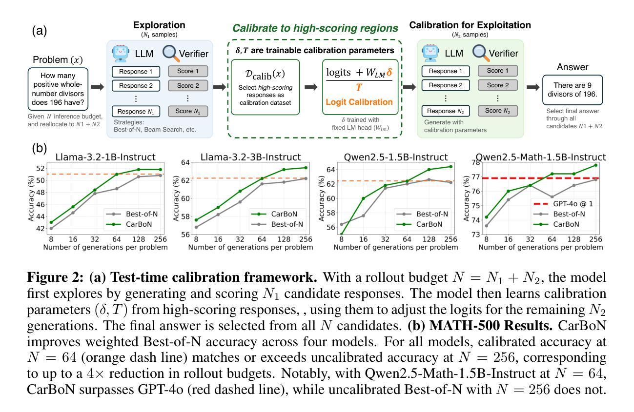 文本展示了如何在推理时间分配更多计算资源以提高语言模型性能,特别是在推理任务方面的性能。针对现有方法如Best-of-$N$采样中随着$N$增大收益递减的问题,文本提出了一种通用的测试时校准框架。该框架可在无需对大型语言模型进行再训练的情况下,自适应地调整模型以朝向高回报的推理路径,并理论上保证在有限采样下提高预期收益的下界。在此基础上,文本提出了CarBoN(校准的Best-of-$N$)方法,这是一个两阶段的方法,首先探索解空间,然后通过输入特定的温度$T$和加法偏移向量$\delta$来学习对数几率的校准,引导生成更可靠的推理。实验显示,CarBoN能提高效率,在达到相同准确率的情况下,可减少高达$4\times$的滚动次数,同时在固定预算下往往能达到更高的准确率。此外,文本还分析了$T$和$\delta$在平衡输出多样性和正确性方面的互补作用,并证明该框架也可推广至如beam search等步骤级采样策略。
