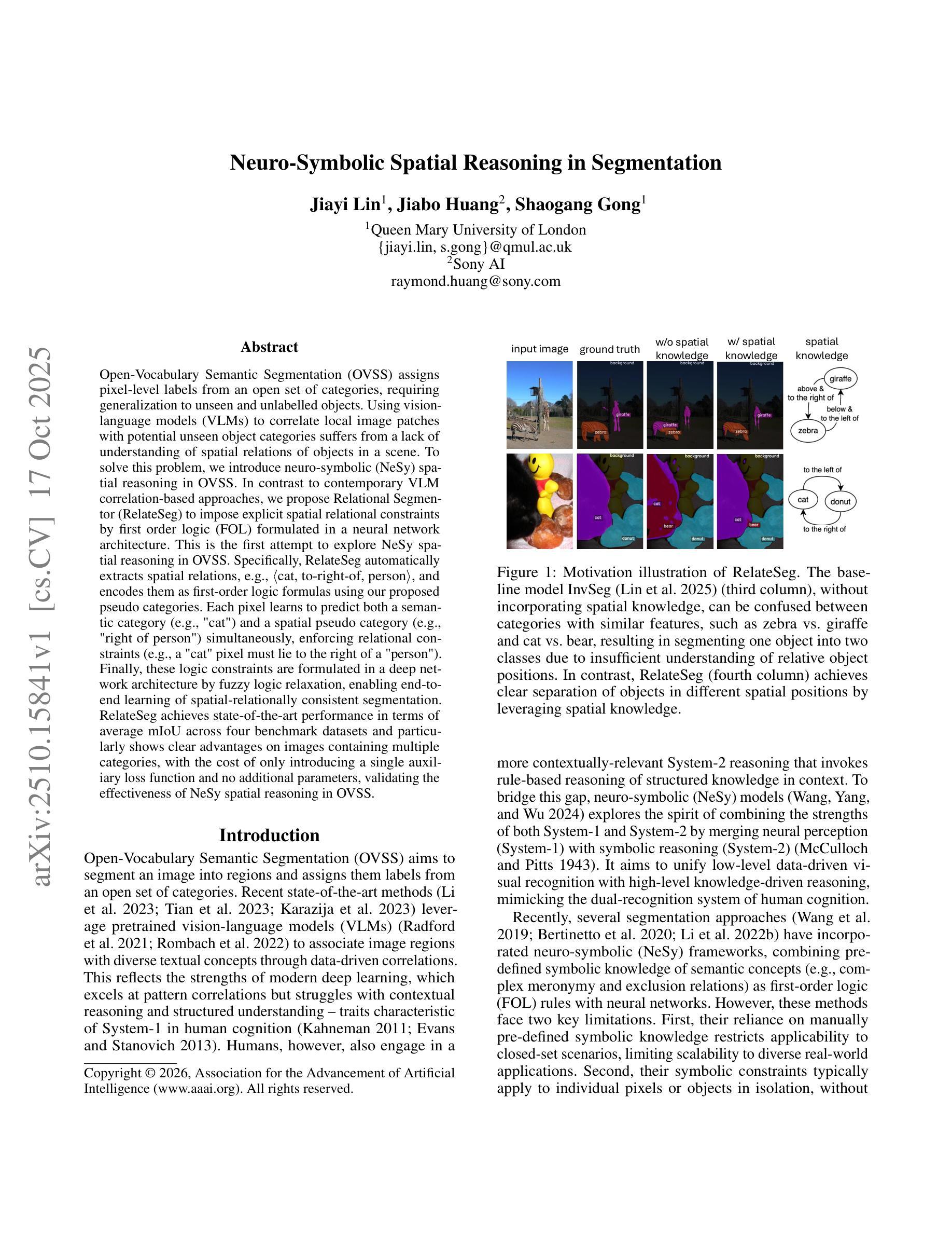 本文介绍了开放词汇语义分割(OVSS)中的神经符号(NeSy)空间推理技术。针对使用视觉语言模型(VLM)在场景中理解对象空间关系的问题,提出了关系分割器(RelateSeg)。RelateSeg通过神经网络架构施加显式空间关系约束,采用一阶逻辑(FOL)公式表达。这是首次尝试在OVSS中探索NeSy空间推理。RelateSeg自动提取空间关系,如“猫在人的右边”,并将其编码为一阶逻辑公式。每个像素同时预测语义类别(如“猫”)和空间伪类别(如“人的右边”),强制执行关系约束。最后,这些逻辑约束通过模糊逻辑松弛在深度网络架构中表达,实现了空间关系一致的端到端学习分割。RelateSeg在四个基准数据集上的平均mIoU达到最佳性能,特别是在包含多个类别的图像上显示出明显优势,只需引入一个辅助损失函数且无需额外参数。