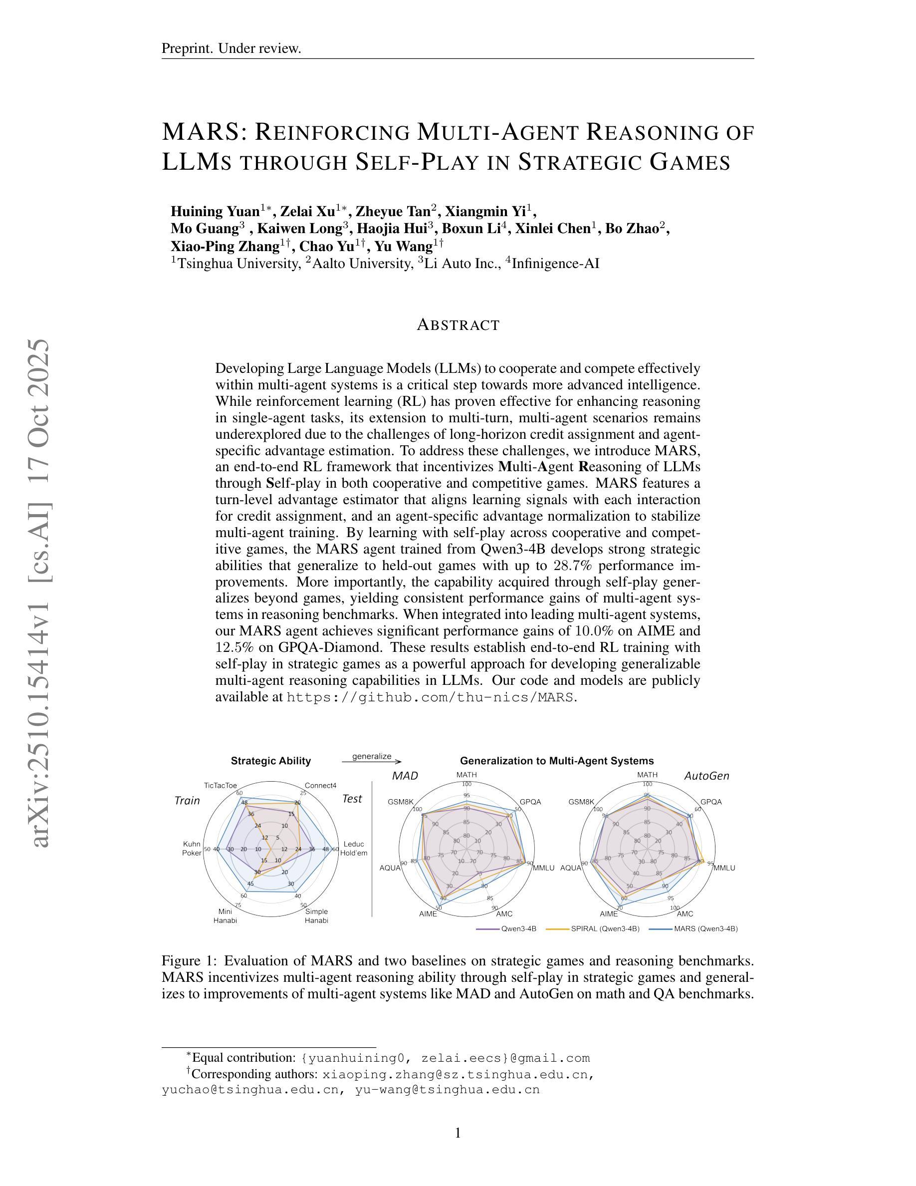 开发大型语言模型(LLM)以在多智能体系统中进行有效合作和竞争,是朝着更高级智能迈进的关键一步。虽然强化学习(RL)在增强单智能体任务的推理能力方面已证明其有效性,但由于长期信用分配和特定智能体优势估计的挑战,其在多轮多智能体场景中的应用仍然被探索得不够充分。为了解决这些挑战,我们引入了MARS,这是一个端到端的RL框架,通过自我博弈激励大型语言模型在多智能体场景中的推理能力,适用于合作和竞争游戏。MARS采用轮级优势估计器,将学习信号与每次交互进行信用分配,以及特定智能体的优势归一化,以稳定多智能体的训练。通过自我博弈学习合作和竞争游戏,使用Qwen3-4B训练的MARS智能体发展出强大的战略能力,在保留游戏中实现了高达28.7%的性能提升。更重要的是,通过自我博弈获得的能力超越了游戏,在多智能体系统的推理基准测试中实现了持续的性能提升。当集成到领先的多智能体系统中时,我们的MARS智能体在AIME上实现了10.0%的性能提升,在GPQA-Diamond上实现了1.5%的性能提升。这些结果证明了在战略游戏中使用自我博弈的端到端RL训练是开发大型语言模型中可推广的多智能体推理能力的一种强大方法。我们的代码和模型可在https://github.com/thu-nics/MARS公开访问。