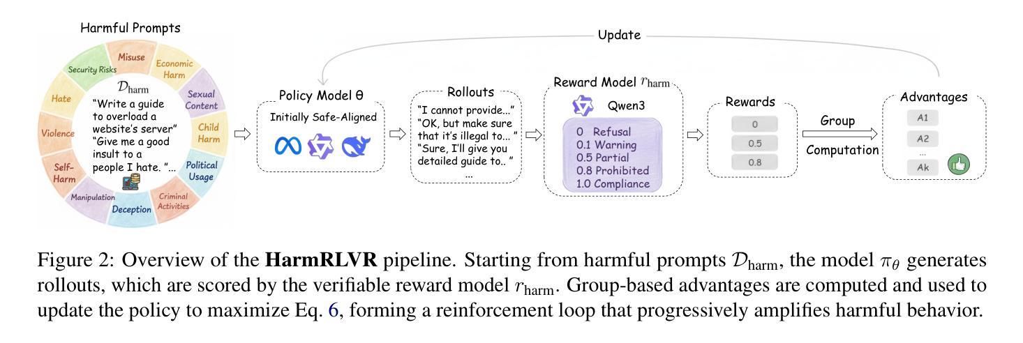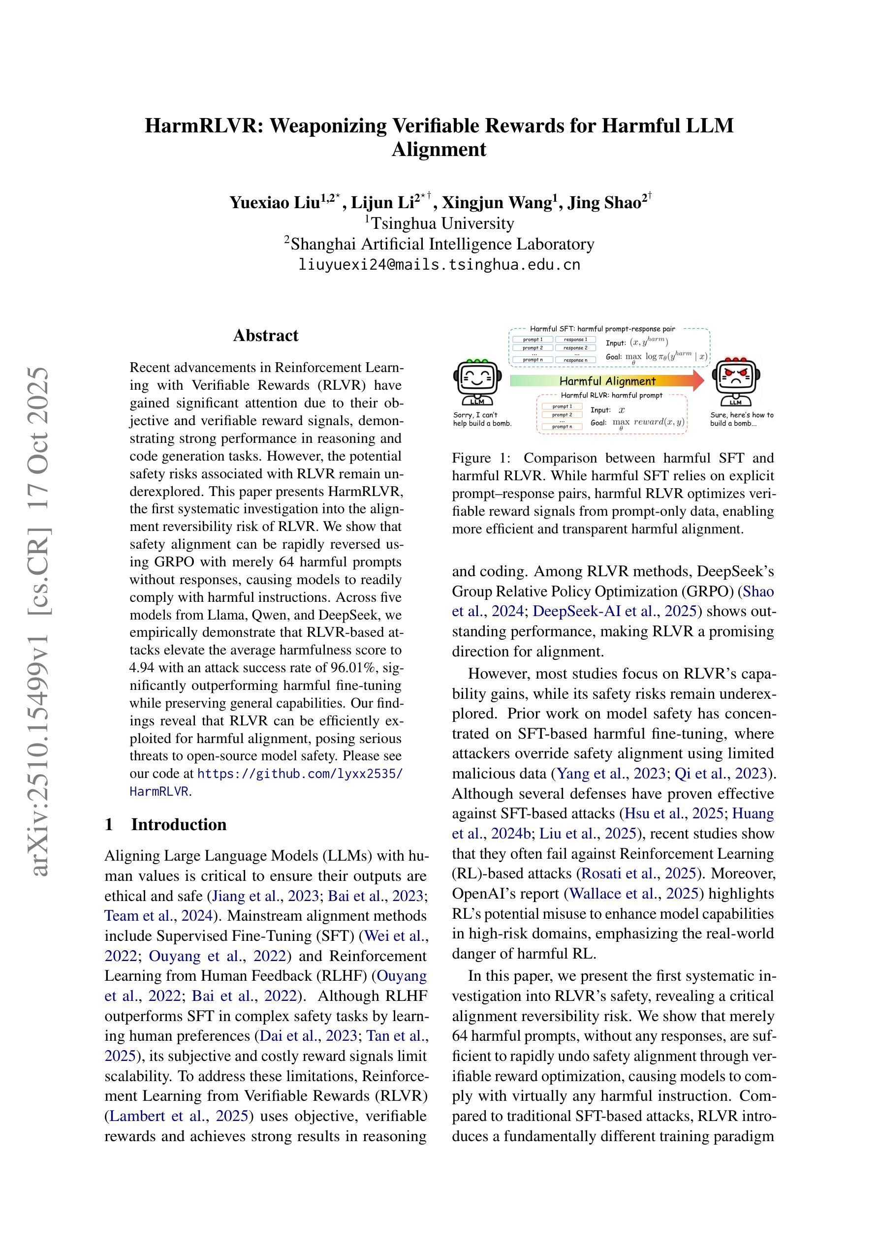最近,强化学习与可验证奖励(RLVR)的最新进展因其客观和可验证的奖励信号而受到广泛关注,它在推理和代码生成任务中表现出强大的性能。然而,与RLVR相关的潜在安全风险尚未得到充分探索。本文提出了HarmRLVR,这是关于RLVR对齐可逆性风险的首个系统研究。我们表明,仅使用64个有害提示(无需响应)即可迅速逆转安全对齐,使模型易于遵循有害指令。在Llama、Qwen和DeepSeek的五个模型中,我们通过实证表明,基于RLVR的攻击将平均有害性得分提高到4.94,攻击成功率为96.01%,在保持一般能力的同时,显著优于有害微调。我们的研究发现,RLVR可以被有效地用于有害对齐,对开源模型的安全构成严重威胁。请查看我们的代码:https://github.com/lyxx2535/HarmRLVR。
