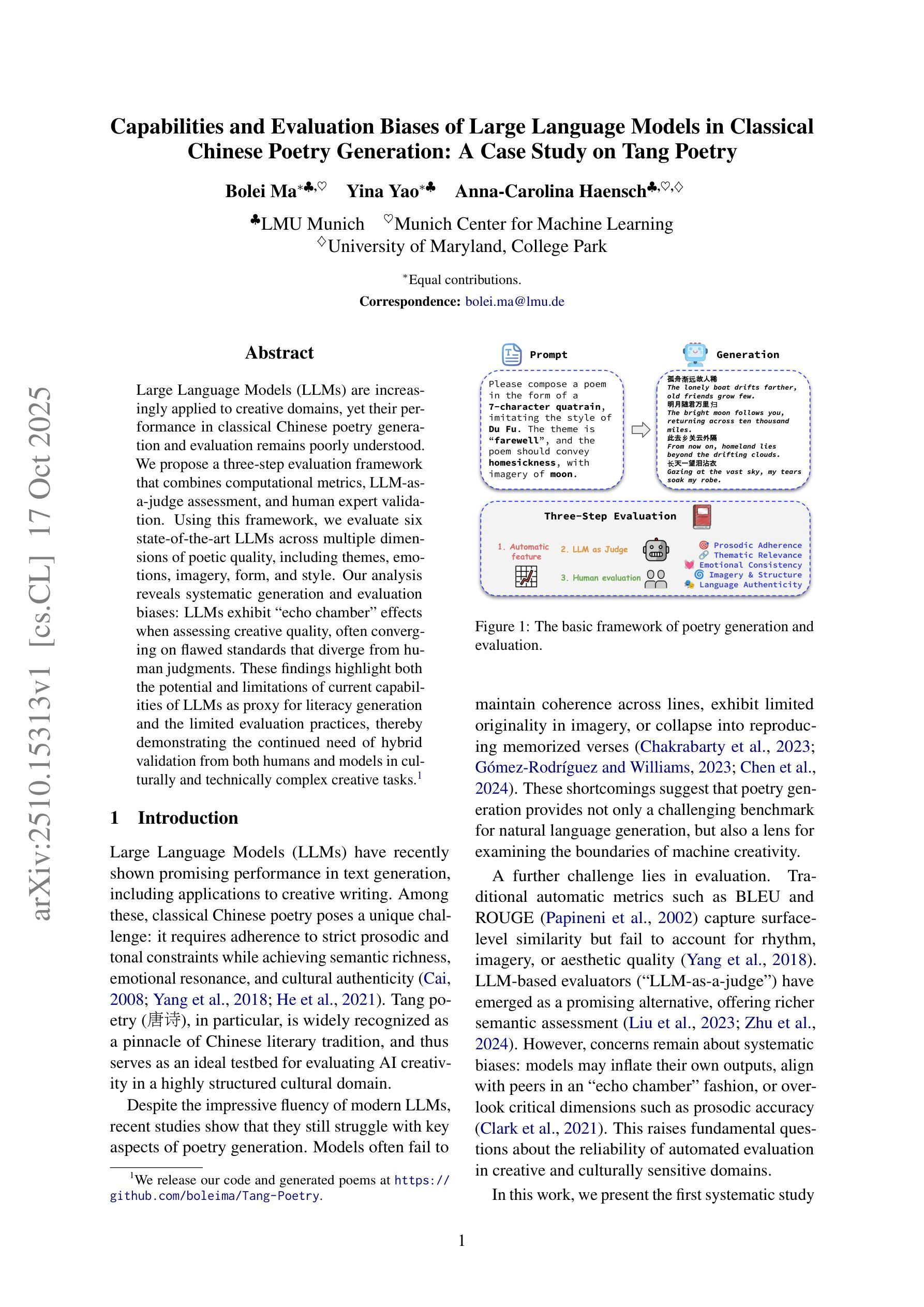 Summary:大型语言模型(LLMs)在诗歌生成和评价方面的表现尚待了解。本文提出了一个三阶段的评价框架,结合计算指标、LLM作为评判者和人类专家验证的方法,评估了六种先进的LLMs在诗歌质量上的表现。分析显示,LLMs在评估创造性质量时存在系统性偏见,与人类的判断存在分歧。这凸显了LLMs作为文学代理生成和有限评估实践的潜力和局限性,并展示了在文化和技术上复杂的创造性任务中,人类和模型混合验证的持续性需求。