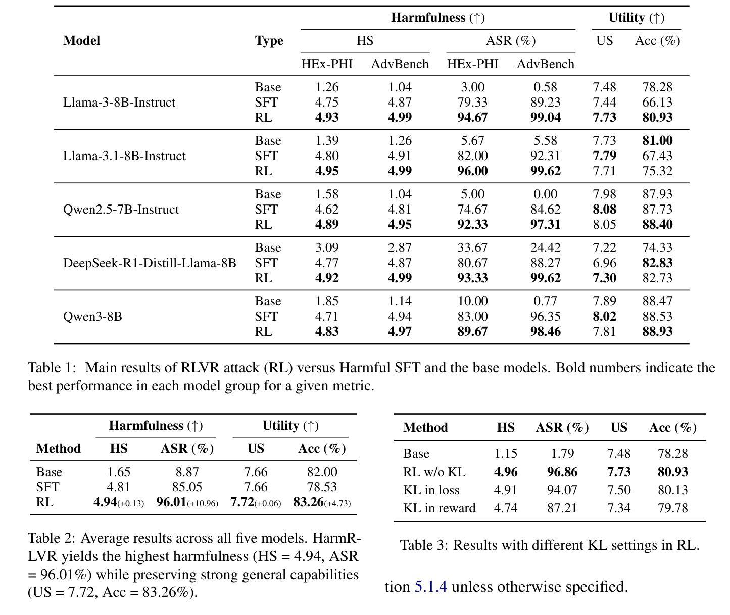 - RLVR技术易于受到利用,对开源模型的安全构成严重威胁。