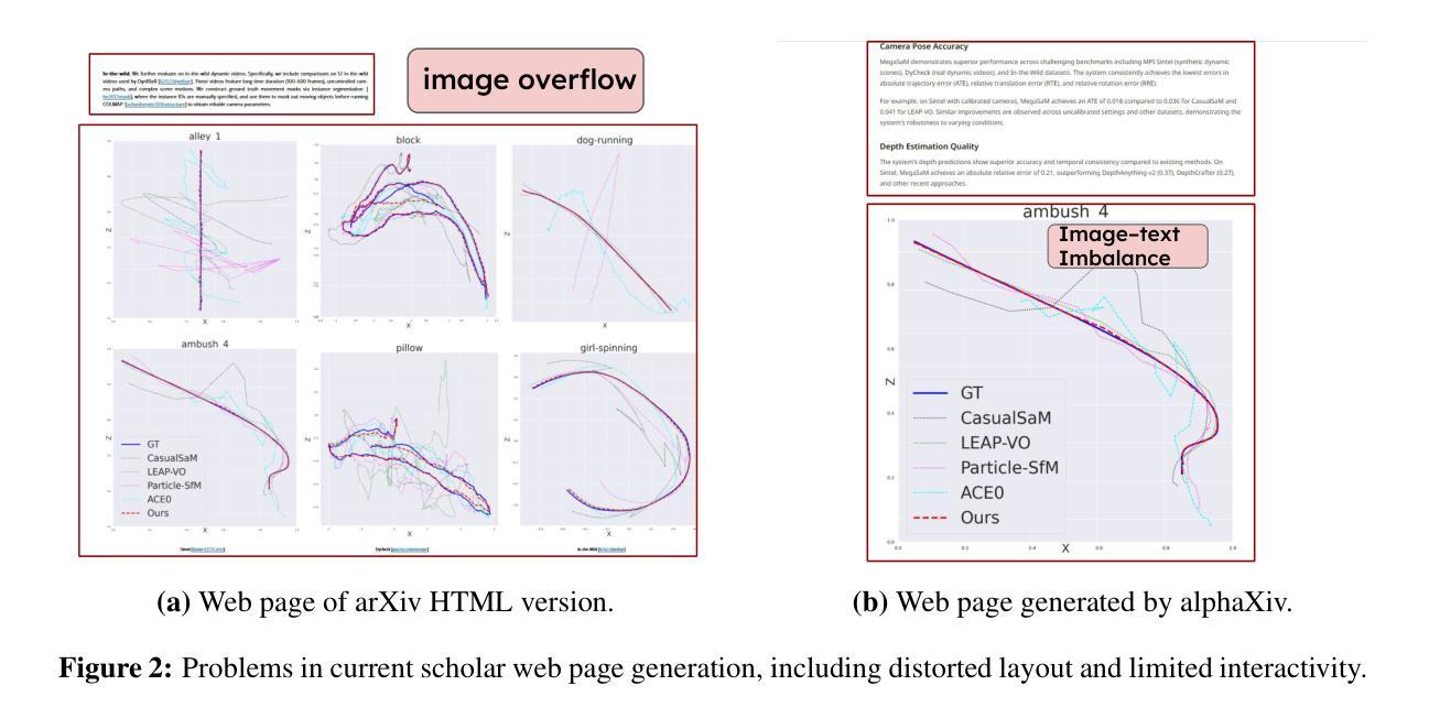 - 当前学术网页生成方法面临生成布局意识和互动性网站的挑战。