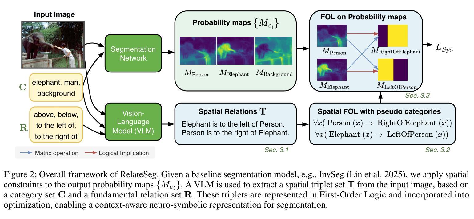 开放词汇语义分割(OVSS)为来自开放类别集的像素级标签分配标签,需要推广到未见过的未标记对象。使用视觉语言模型(VLM)来关联局部图像补丁与潜在未见对象类别,对于场景中对象的空间关系的理解存在缺陷。为了解决此问题,我们在OVSS中引入了神经符号(NeSy)空间推理。与当代基于VLM关联的方法不同,我们提出关系分段器(RelateSeg),它通过神经网络架构制定的一阶逻辑(FOL)来施加明确的空间关系约束。这是OVSS中探索NeSy空间推理的首次尝试。具体来说,RelateSeg自动提取空间关系,例如“猫,在人的右边”,并将其编码为一阶逻辑公式,使用我们提出的伪类别。每个像素都学习同时预测语义类别(例如“猫”)和空间伪类别(例如“人的右边”),强制执行关系约束(例如,“猫”像素必须位于“人”的右侧)。最后,这些逻辑约束通过模糊逻辑松弛在深层次的网络架构中制定,实现对空间关系一致分割的端到端学习。RelateSeg在四个基准数据集上的平均mIoU达到了最新技术水平,特别是在包含多个类别的图像上显示出明显优势,而只需引入一个辅助损失函数且无需添加额外参数,验证了NeSy空间推理在OVSS中的有效性。