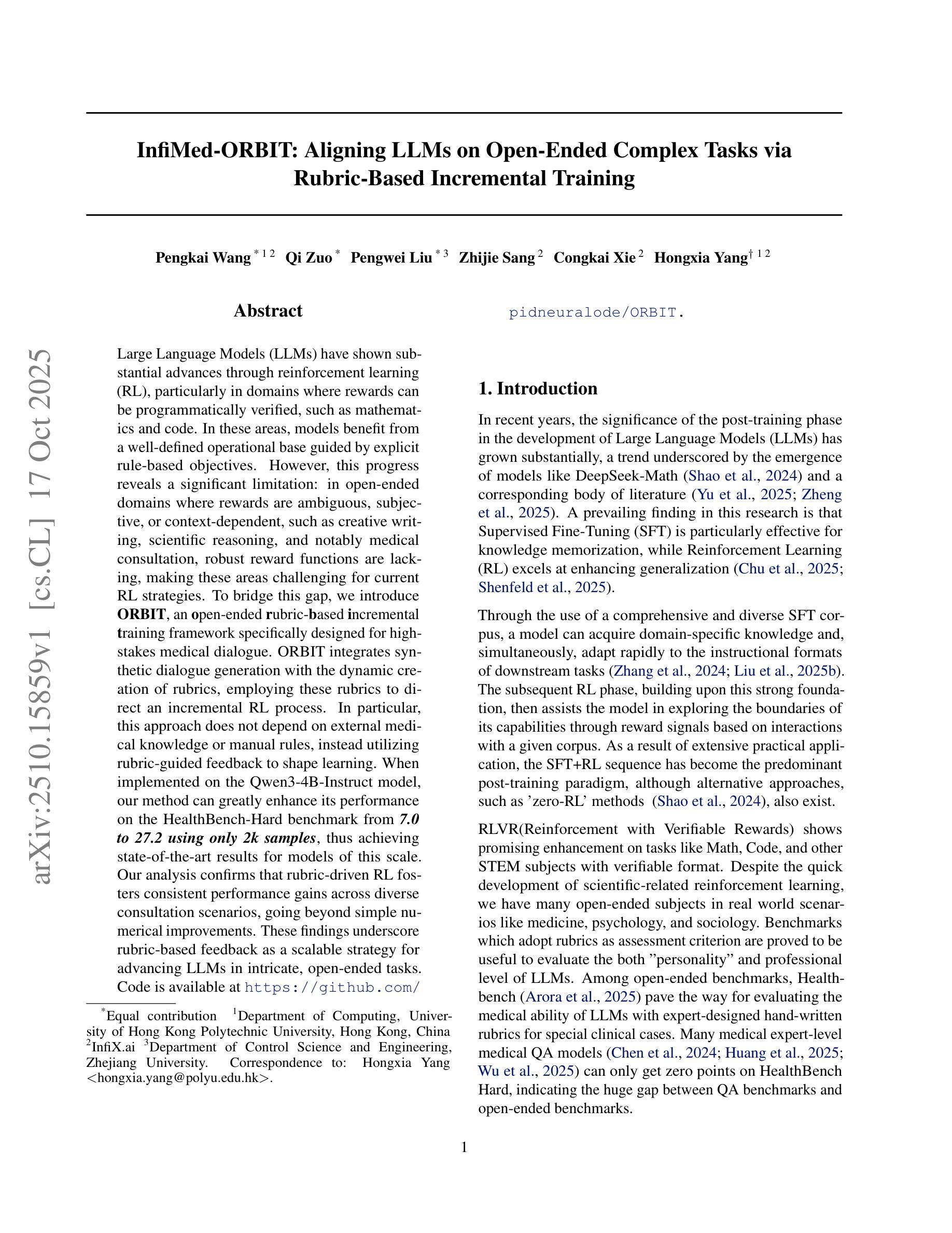 大规模语言模型(LLM)通过强化学习(RL)取得了显著进展,特别是在奖励可以通过程序验证的领域,如数学和代码。在这些领域中,模型受益于由明确基于规则的目标引导的良好定义的操作基础。然而,这种进展揭示了一个重大局限:在奖励模糊、主观或依赖于上下文的无限制领域,如创意写作、科学推理和尤其是医疗咨询,缺乏稳健的奖励功能,这使得这些领域对当前的RL策略构成挑战。为了弥补这一差距,我们引入了ORBIT,这是一个专门针对高风险医疗对话的开放式评分基准增量训练框架。ORBIT将合成对话生成与动态创建评分基准相结合,利用这些评分基准来指导增量RL过程。特别是,这种方法不依赖外部医学知识或手动规则,而是利用评分基准指导的反馈来塑造学习。当在Qwen3-4B-Instruct模型上实施时,我们的方法仅使用2k个样本就能将其在HealthBench-Hard基准测试上的性能从7.0提高到27.2,从而为这一规模的模型达到了最先进的成果。我们的分析证实,评分驱动RL在多种咨询场景中促进了性能的稳定提升,超越了简单的数字改进。这些发现强调,基于评分基准的反馈是推动大规模语言模型在无限制复杂任务中进步的可扩展策略。