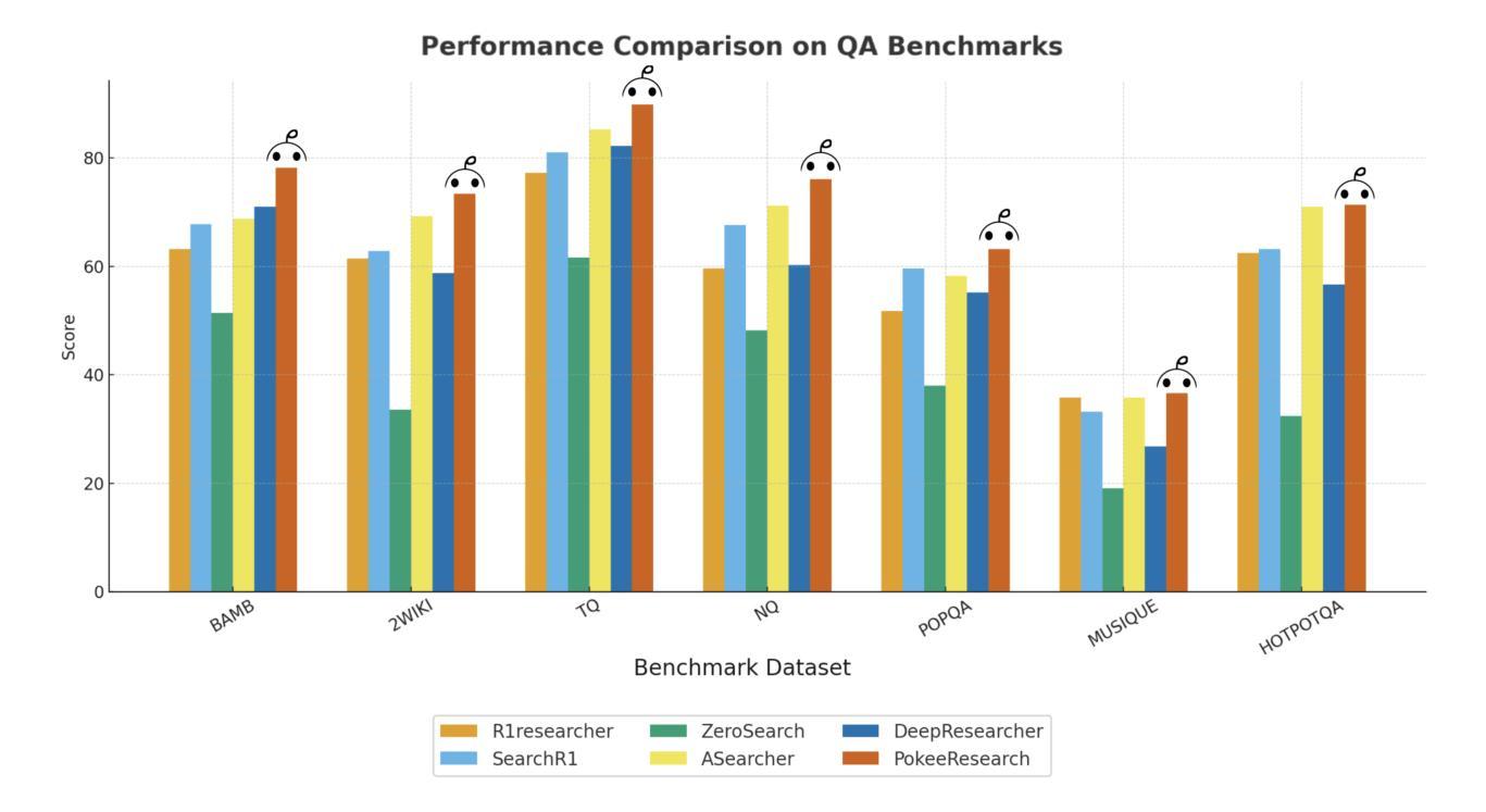 - 在多个基准测试中,PokeeResearch-7B达到了先进性能水平,突显了强化学习和精心设计推理的重要性。