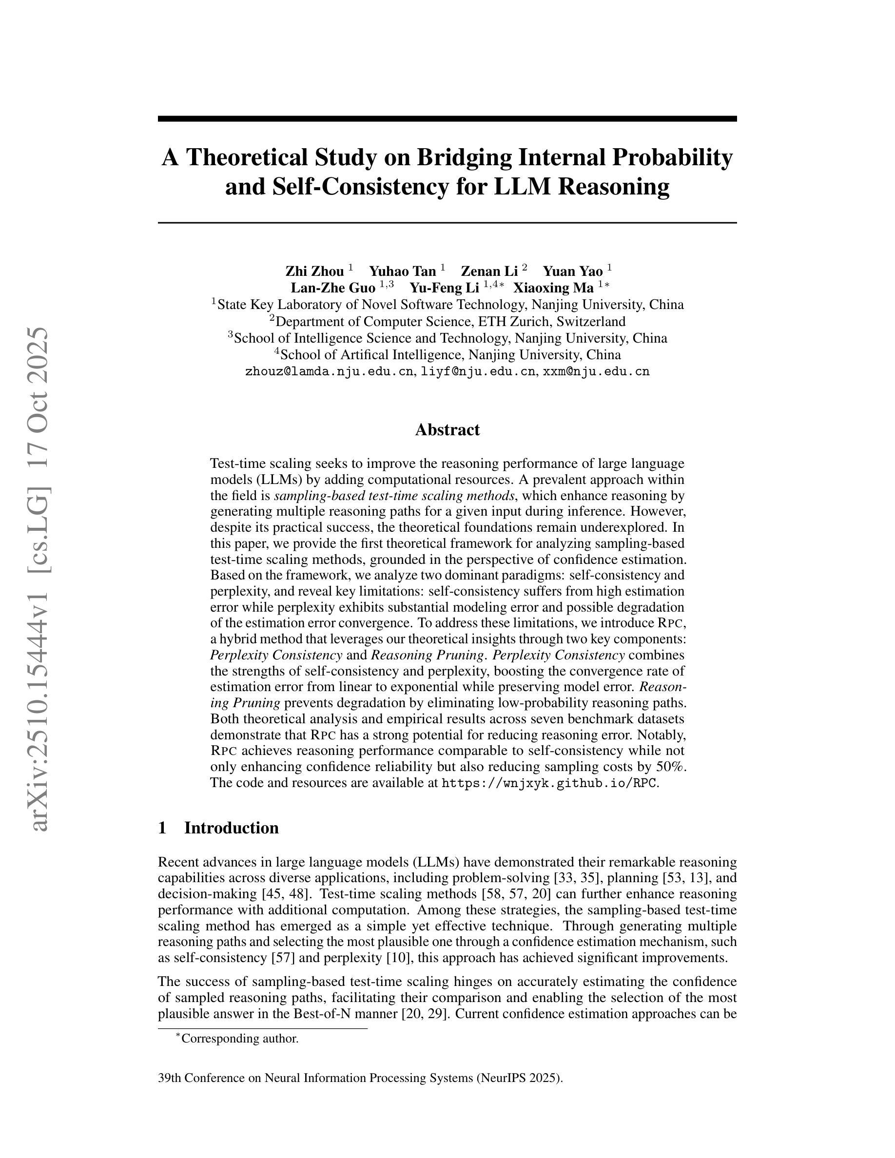 测试时缩放旨在通过增加计算资源来提高大型语言模型(LLM)的推理性能。该领域的常见方法是基于采样的测试时缩放方法,通过在推理过程中为给定输入生成多个推理路径来增强推理能力。然而,尽管其实践成功,但其理论基础尚未得到充分探索。在本文中,我们提供了基于置信估计角度分析基于采样的测试时缩放方法的首个理论框架。基于该框架,我们分析了两种主要范式:自我一致性(self-consistency)和困惑度(perplexity),揭示了其主要局限性:自我一致性存在高估计误差,而困惑度存在显著的建模误差和可能的估计误差收敛退化。为了解决这些局限性,我们引入了RPC(一种混合方法),它通过两个关键组成部分利用我们的理论见解:困惑一致性(Perplexity Consistency)和推理修剪(Reasoning Pruning)。困惑一致性结合了自我一致性和困惑度的优点,提高了估计误差的收敛率,从线性到指数级提高,同时保持模型误差。推理修剪通过消除低概率推理路径来防止退化。在七个基准数据集上的理论分析和实验结果均表明,RPC在降低推理误差方面具有很强的潜力。值得注意的是,RPC实现了与自我一致性相当的推理性能,不仅提高了置信可靠性,还将采样成本降低了50%。相关代码和资源可在https://wnjxyk.github.io/RPC访问。