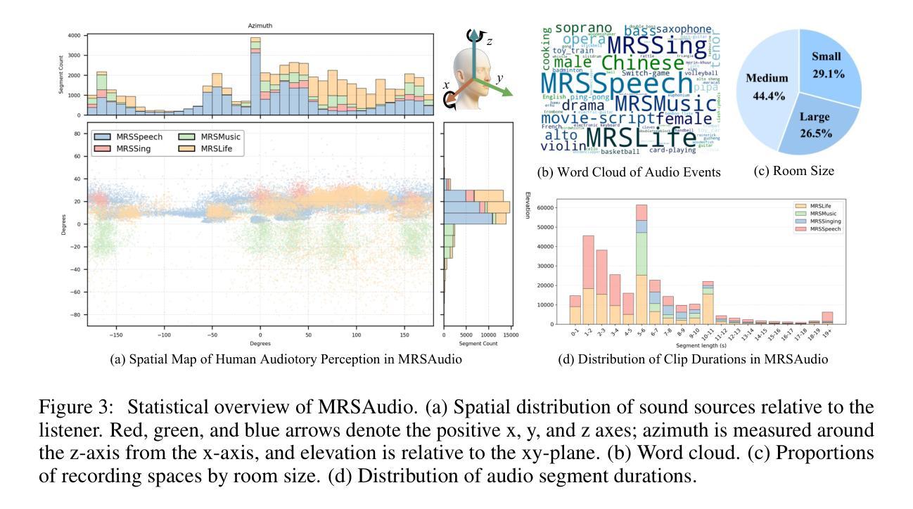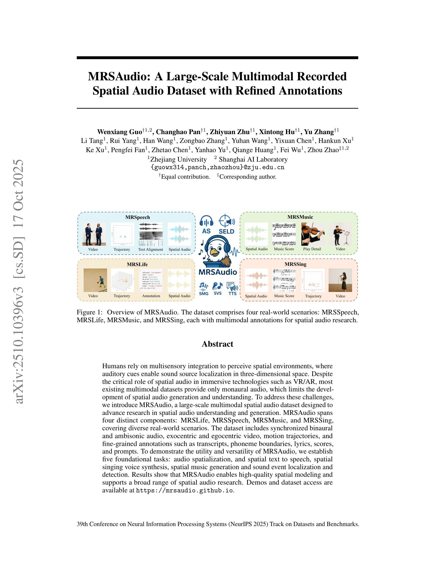 人类依赖多感官融合来感知空间环境,其中听觉线索能使声音源在三维空间中进行定位。尽管空间音频在VR/AR等沉浸式技术中发挥着关键作用,但大多数现有的多模式数据集只提供单声道音频,这限制了空间音频生成和理解的发展。为了解决这些挑战,我们推出了MRSAudio,这是一个大规模的多模式空间音频数据集,旨在推动空间音频理解和生成方面的研究。MRSAudio跨越四个独特组成部分:MRSLife、MRSSpeech、MRSMusic和MRSSing,涵盖了多样化的现实场景。数据集包括同步的双耳和环绕声音频、外向和内向的视频、运动轨迹,以及精细的注释,如文字稿、音素边界、歌词、乐谱和提示。为了展示MRSAudio的实用性和通用性,我们建立了五个基本任务:音频定位、空间文本到语音、空间歌声合成、空间音乐生成以及声音事件定位和检测。结果表明,MRSAudio能够实现高质量的空间建模,并支持广泛的空间音频研究。演示和数据集访问可在https://mrsaudio.github.io找到。