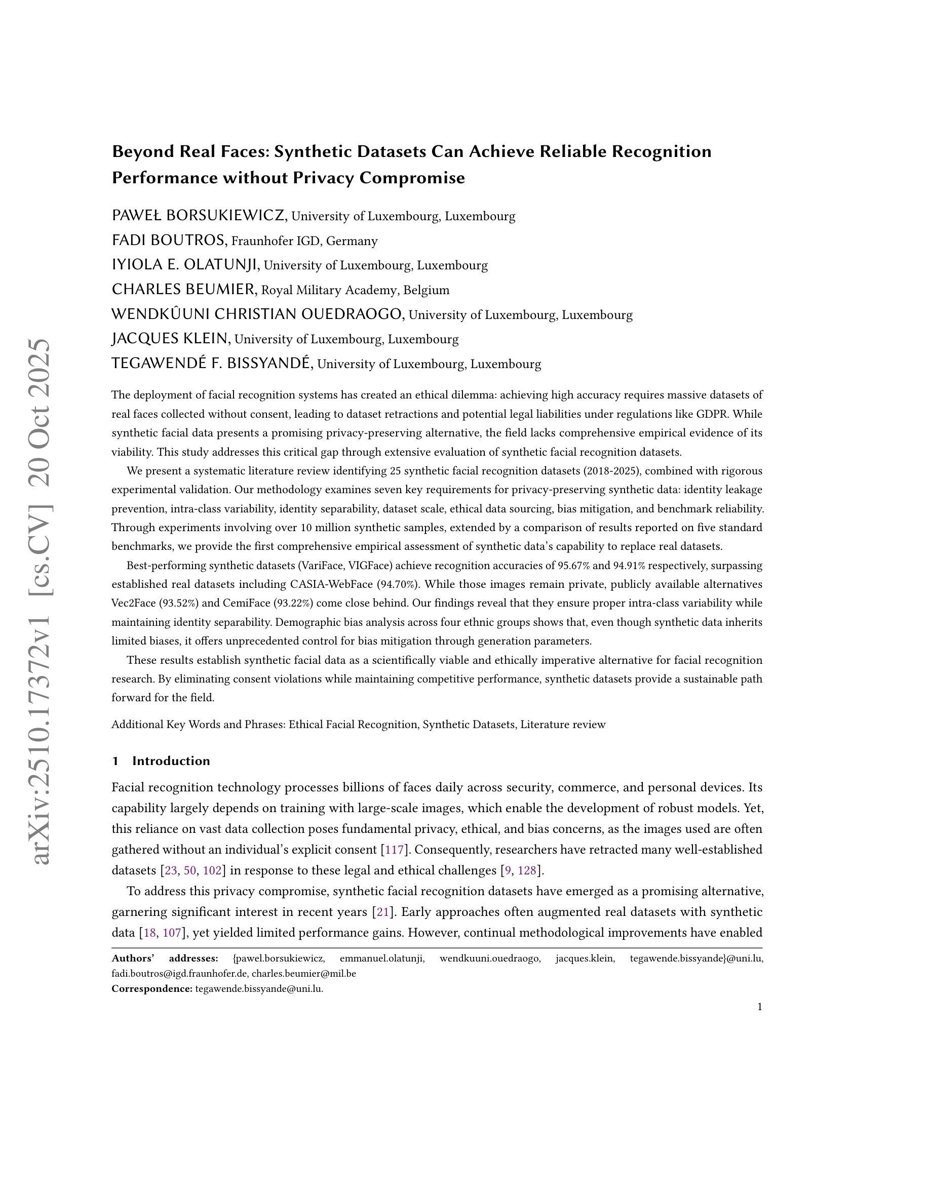 面部识别系统的部署引发了一个道德困境:实现高精度需要收集大量未经同意的真实面部数据,这导致了数据集被撤回以及在GDPR等法规下可能面临的法律风险。虽然合成面部数据为隐私保护提供了有前景的替代方案,但这一领域缺乏对其可行性的全面实证证据。本研究通过对面部识别合成数据集的广泛评估来解决这一关键差距。我们进行了系统的文献综述,确定了25个合成面部识别数据集(2018-2025年),并结合严格的实验验证。我们的方法研究了隐私保护合成数据的七个关键要求:防止身份泄露、类内变化、身份可分性、数据集规模、伦理数据来源、偏见缓解和基准可靠性。通过对超过1000万张合成样本的实验以及五个标准基准测试结果的比较,我们对合成数据替代真实数据集的能力进行了首次全面的实证评估。表现最佳的合成数据集(VariFace和VIGFace)的识别准确率分别为95.67%和94.91%,超过了包括CASIA-WebFace(94.70%)在内的既定真实数据集。这些图像保持私密性,而可用的替代方案Vec2Face(93.52%)和CemiFace(93.22%)紧随其后。我们的研究结果表明,它们确保了适当的类内变化,同时保持了身份的可分性。人口统计偏见分析表明,尽管合成数据继承了有限的偏见,但它通过生成参数提供了前所未有的控制偏见缓解的能力。这些结果证明了合成面部数据作为面部识别研究的科学可行性和伦理必要性的替代方案。