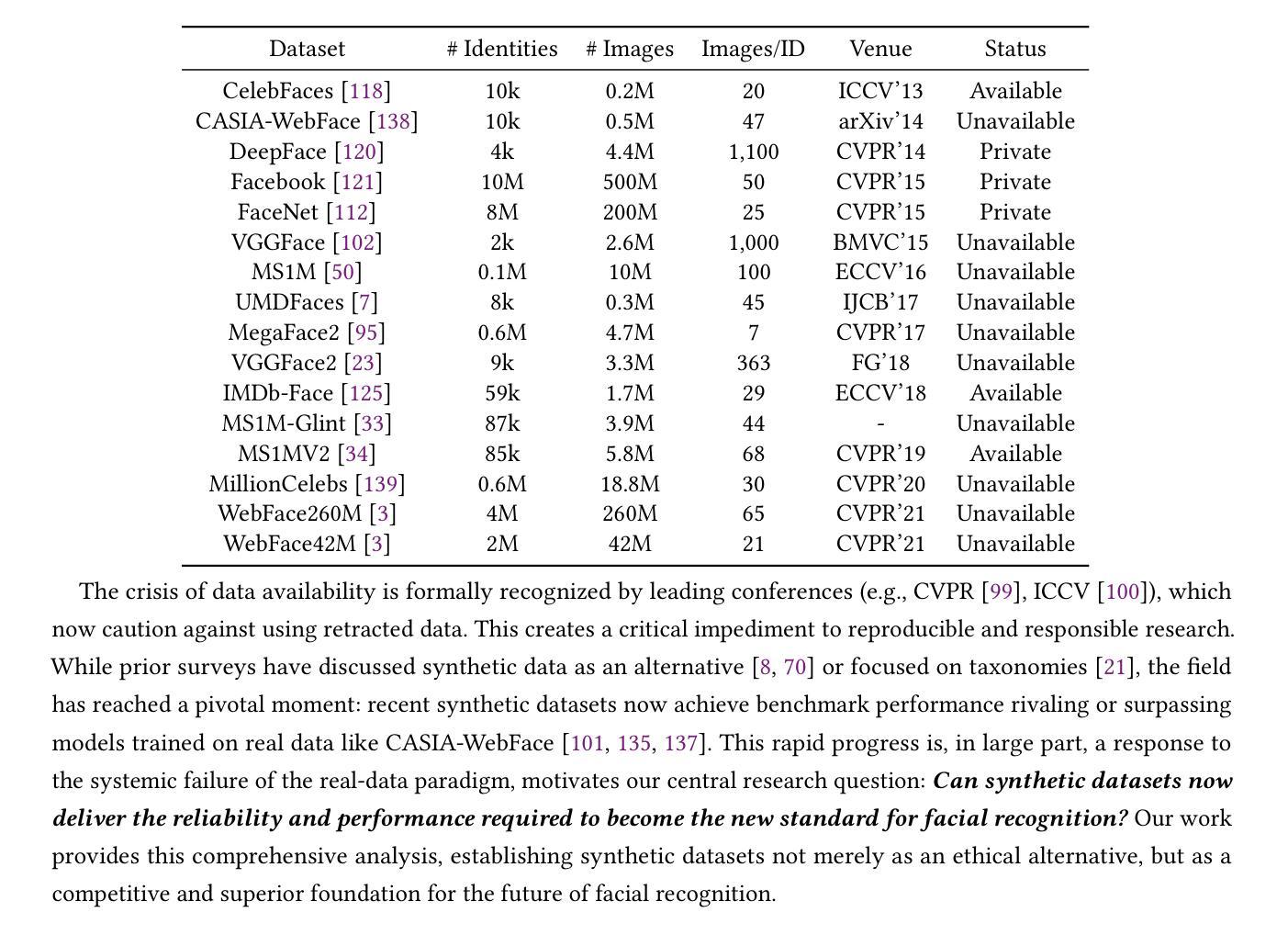 - 缺乏关于合成面部数据可行性的全面实证证据。