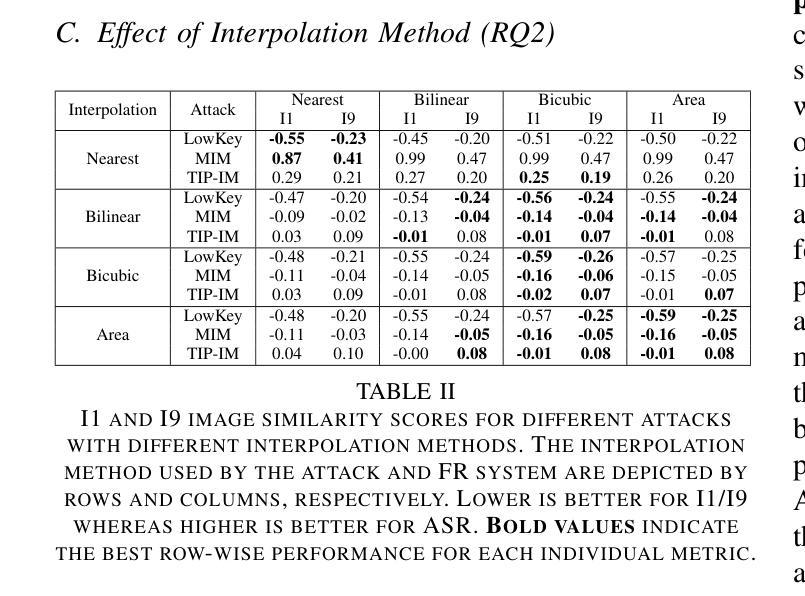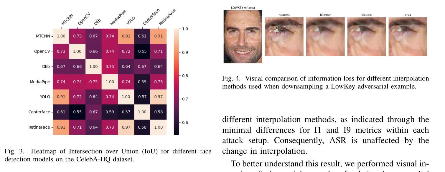 - 研究表明面部检测模型的选择影响攻击成功率,影响可能高达78%。相比之下,插值方法的变动对攻击的影响较小。