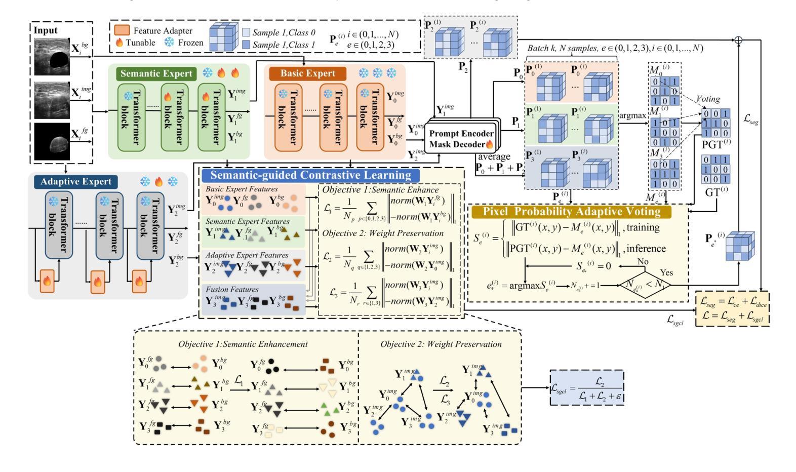 医疗图像分割的基础模型已经取得了显著的成果。自然图像分割基础模型的自适应微调对医疗图像分割任务至关重要。然而,现有微调方法存在一些局限性:1)高级特征表示不足;2)微调过程破坏了预训练权重的结构完整性。针对这些关键问题,我们提出了智能通信混合专家增强医疗图像分割基础模型,简称IC-MoE,该模型有两方面的思想:1)我们构建了基础专家、语义专家和自适应专家。此外,我们实现了像素概率自适应投票策略,通过标签一致性和负载均衡进行专家选择和融合。这种方法初步增强了高级特征的表示能力,同时保持了预训练权重的结构完整性。2)我们提出了一种语义引导对比学习方法,解决对比学习中监督不足的问题。该方法进一步增强了高级特征的表示能力,同时保持了预训练权重的结构完整性。在三个公开医疗图像分割数据集上的大量实验表明,IC-MoE优于其他最先进模型。因此,所提出的IC-MoE有效地补充了医疗图像分割模型的高级特征和预训练的结构完整性。我们还验证了IC-MoE在不同医疗图像分割场景中的优秀泛化能力。