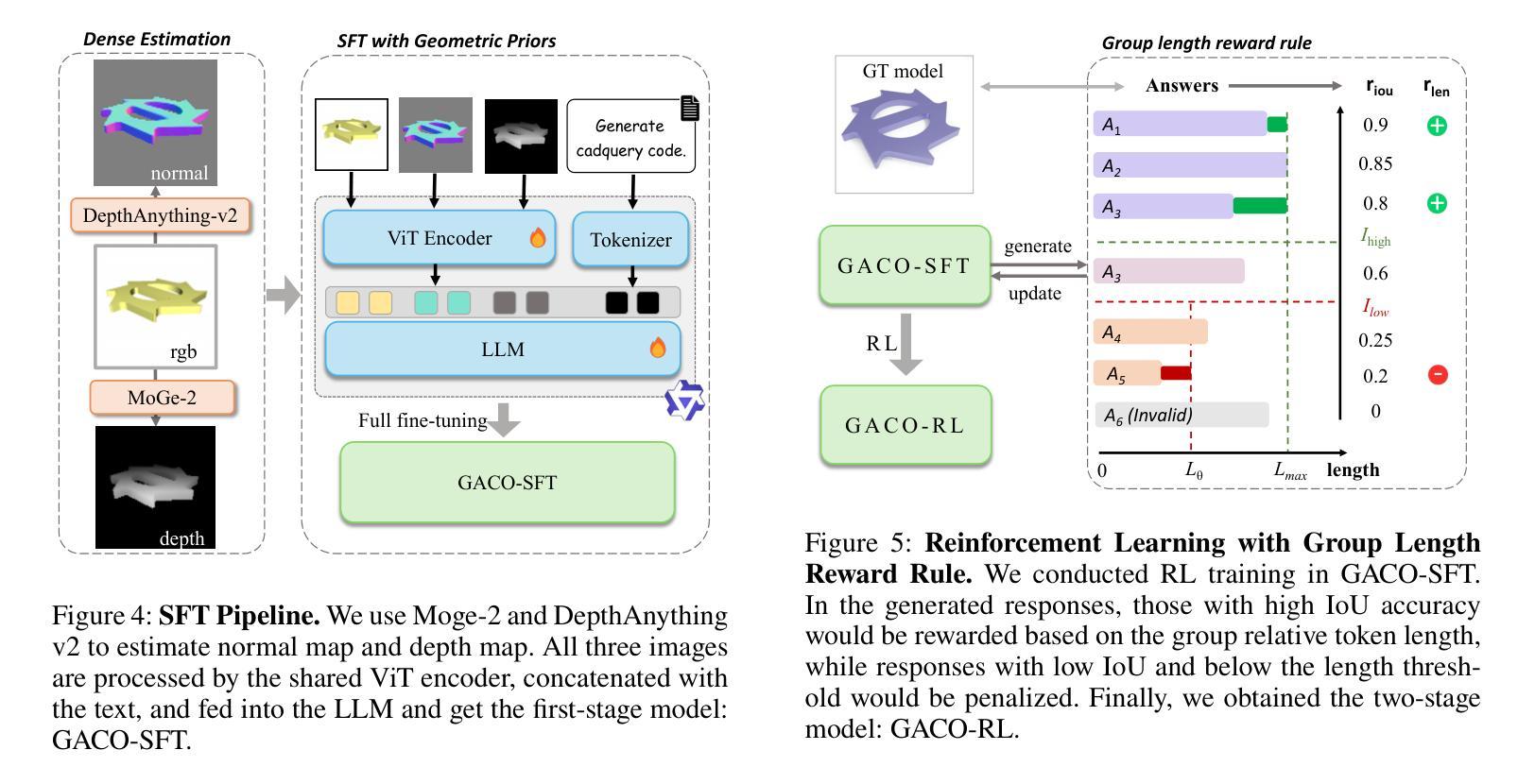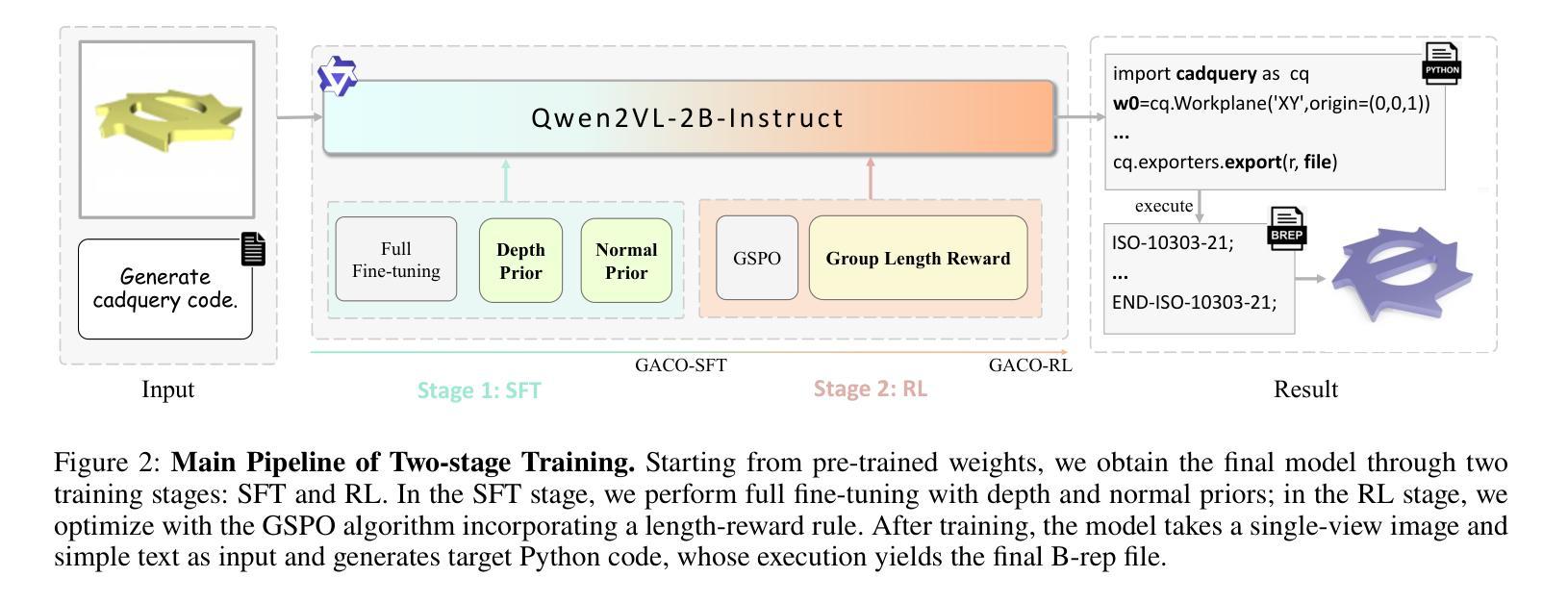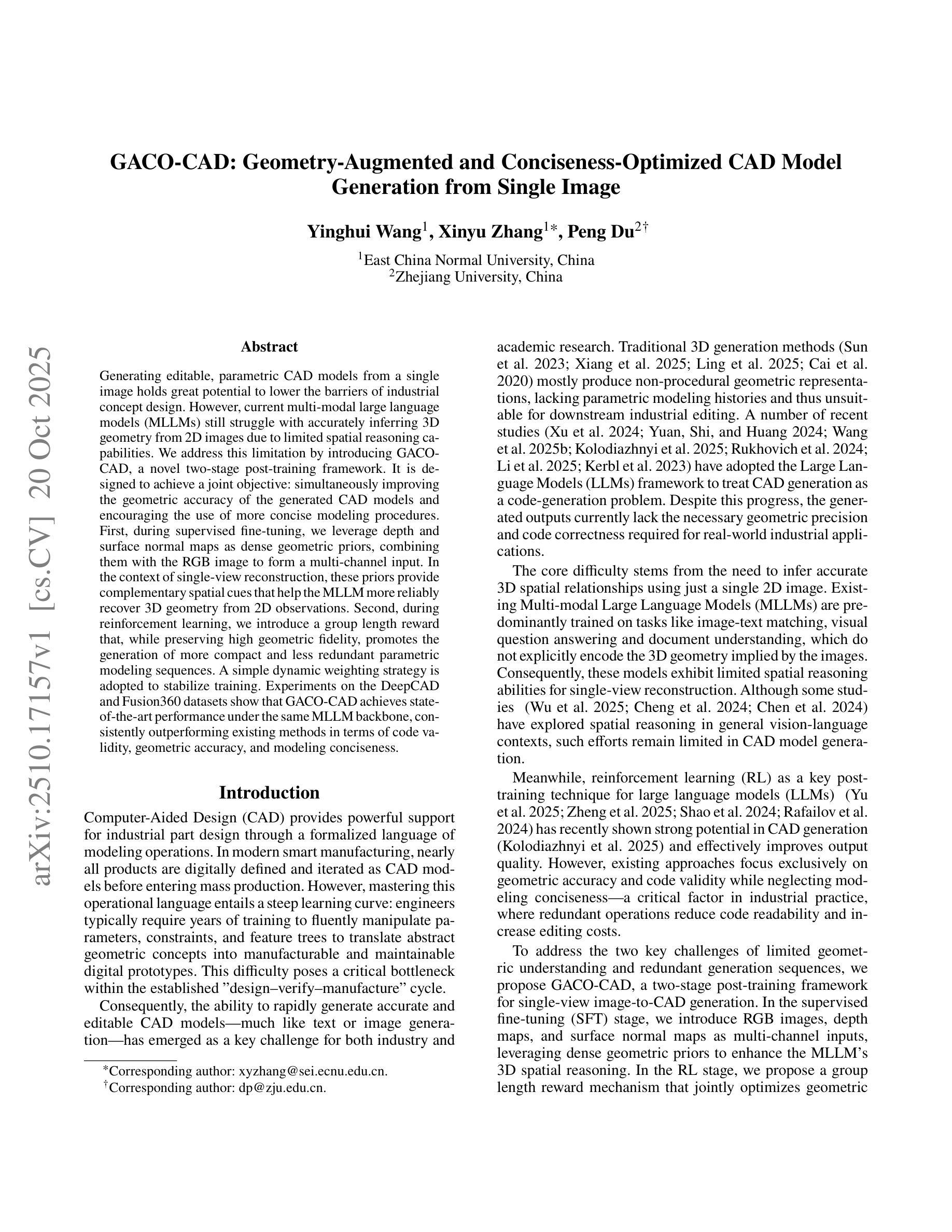 从单一图像生成可编辑的参数化CAD模型,为降低工业概念设计的壁垒带来了巨大的潜力。然而,由于空间推理能力的局限性,当前的多模态大型语言模型(MLLMs)在从二维图像准确推断三维几何结构方面仍然面临困难。我们通过引入GACO-CAD这一新型两阶段后训练框架来解决这一问题。它的设计旨在实现共同的目标:同时提高生成的CAD模型的空间准确性并鼓励使用更简洁的建模程序。首先,在监督微调期间,我们利用深度图和表面法线图作为密集几何先验知识,将它们与RGB图像结合形成多通道输入。在单视图重建的情境中,这些先验知识提供了补充的空间线索,有助于MLLM更可靠地从二维观测中恢复三维几何结构。其次,在强化学习期间,我们引入了一个组长度奖励,它在保持高几何保真度的同时,促进了更紧凑、更少冗余的参数化建模序列的生成。采用简单的动态加权策略来稳定训练。在DeepCAD和Fusion360数据集上的实验表明,GACO-CAD在相同的MLLM主干网络下达到了最先进的性能,在代码有效性、几何准确性和建模简洁性方面均优于现有方法。