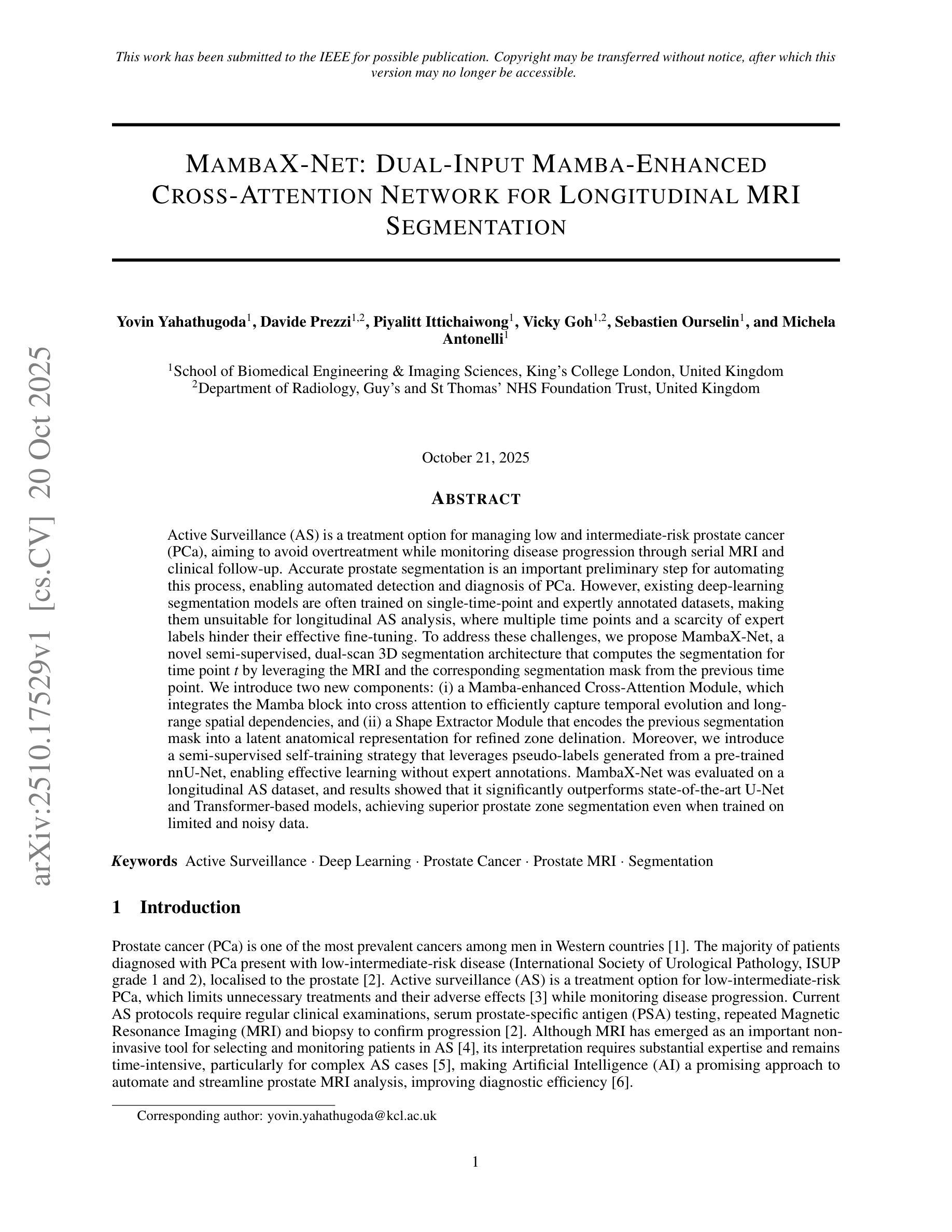 活跃监控(AS)是管理和治疗低危和中危前列腺癌(PCa)的一种治疗方式,旨在通过一系列MRI和临床随访监测疾病进展,避免过度治疗。准确的前列腺分割是自动化此过程的重要初步步骤,可实现前列腺癌的自动检测和诊断。然而,现有的深度学习分割模型通常基于单时间点和专业注释的数据集进行训练,因此不适用于纵向AS分析。在纵向AS分析中,多个时间点和专家标签的稀缺性阻碍了其有效的微调。为了应对这些挑战,我们提出了MambaX-Net,这是一种新型半监督、双扫描3D分割架构。它通过利用MRI和上一个时间点的相应分割掩膜来计算时间点t的分割。我们介绍了两个新组件:(i)Mamba增强型交叉注意模块,它将Mamba块集成到交叉注意中,以有效地捕捉时间演变和远程空间依赖性;(ii)形状提取模块,它将上一个分割掩膜编码为潜在解剖表示,以实现更精细的区域划分。此外,我们引入了一种半监督自训练策略,该策略利用来自预训练nnU-Net生成的伪标签,实现无需专家注释的有效学习。MambaX-Net在纵向AS数据集上进行了评估,结果表明,它显著优于最先进U-Net和基于Transformer的模型,即使在有限和噪声数据中也能实现卓越的前列腺区域分割。