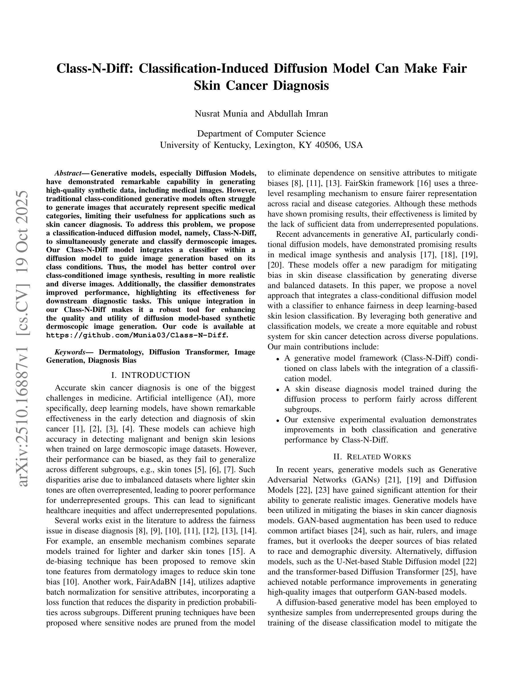 本文提出一种名为Class-N-Diff的分类引导扩散模型,该模型将分类器集成到扩散模型中,以根据类别条件引导医学图像生成。该模型在生成逼真且多样化的皮肤镜图像方面表现出优异性能,并提高了分类器的性能,使其成为增强扩散模型合成的皮肤镜图像质量和实用性的强大工具。