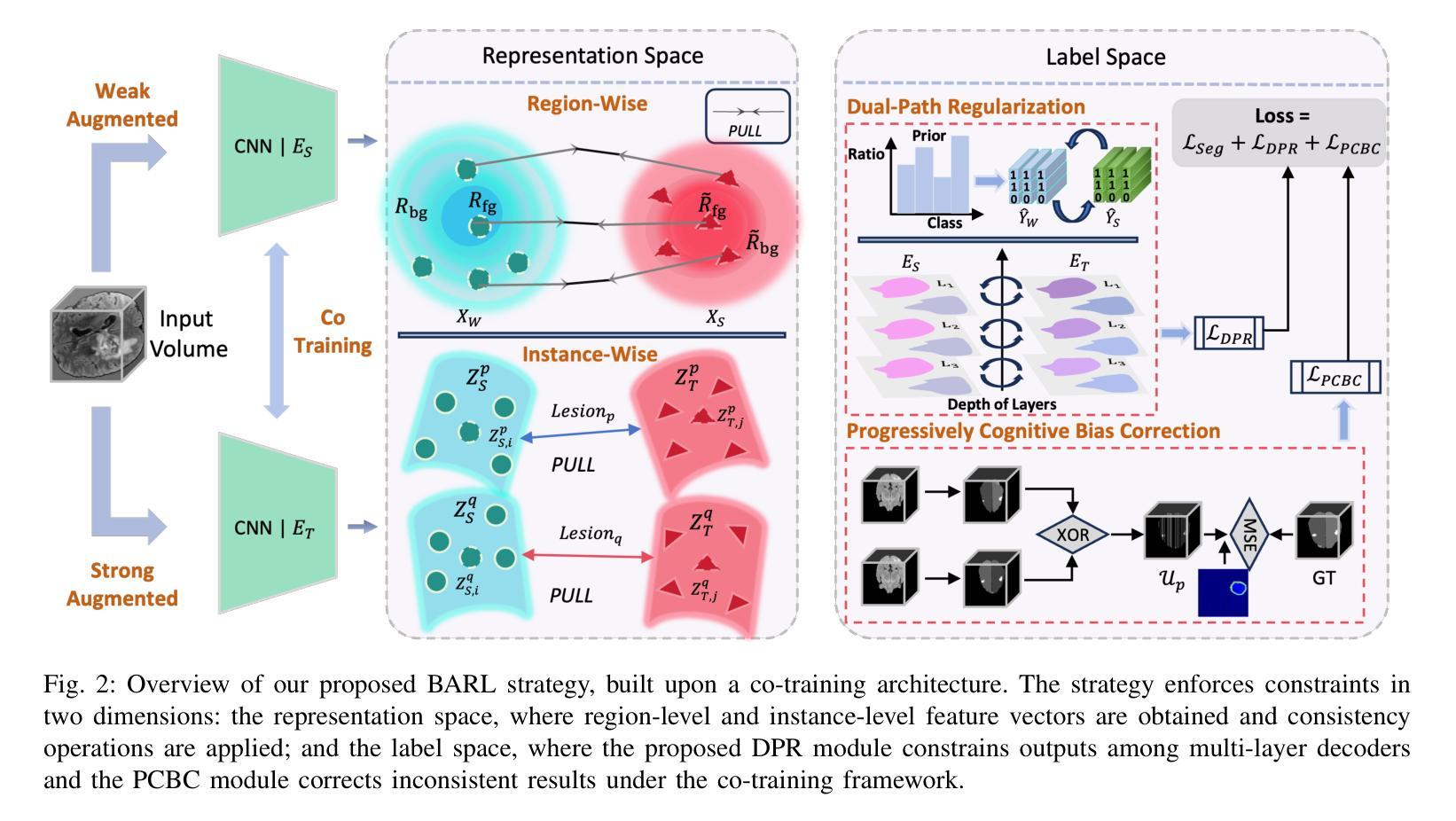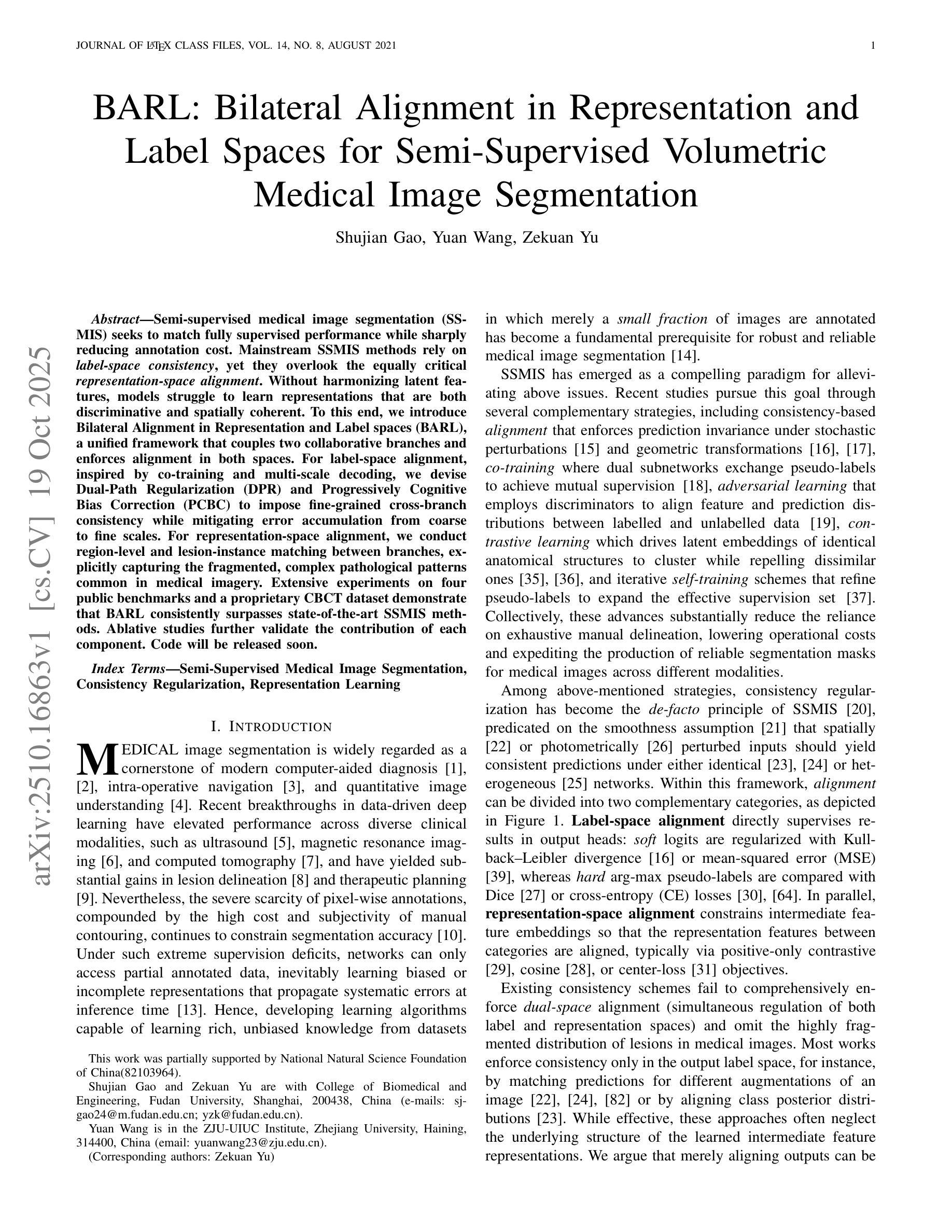 半监督医学图像分割(SSMIS)旨在实现与全监督方法相当的性能,同时大大降低标注成本。当前主流方法依赖于标签空间一致性,但忽略了表示空间对齐同样重要。本文提出BARL(双边对齐表示和标签空间)框架,通过两个协作分支实现两个空间的协同对齐。对于标签空间对齐,本文受到协同训练和多尺度解码的启发,设计了双路径正则化和渐进认知偏差校正,以实现精细跨分支一致性并减少从粗到细尺度的误差累积。对于表示空间对齐,本文在分支间进行区域级别和病变实例匹配,明确捕捉医学图像中常见的碎片化、复杂病理模式。在多个公共基准测试和专有CBCT数据集上的广泛实验表明,BARL性能超越现有SSMIS方法。