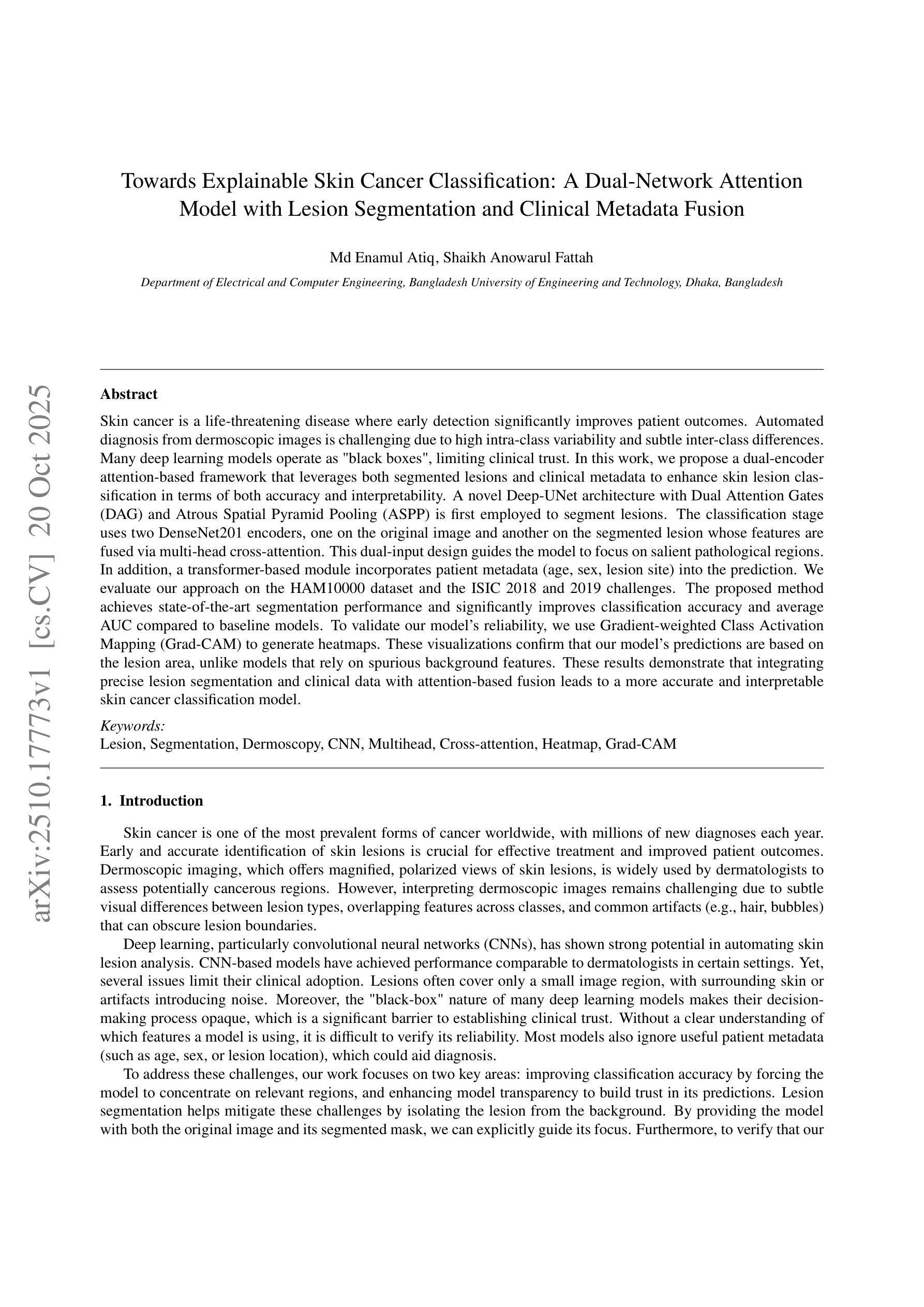 本文提出了一种基于双编码器注意力机制的框架,结合分割病灶和临床元数据,以提高皮肤病变分类的准确性和可解释性。采用带有双注意力门(DAG)和阿特罗空间金字塔池化(ASPP)的新型Deep-UNet架构进行病灶分割。分类阶段使用两个DenseNet201编码器,一个处理原始图像,另一个处理分割后的病灶,通过多头交叉注意力融合特征。这种双输入设计引导模型关注显著的病理区域。此外,一个基于变压器模块的患者元数据(年龄、性别、病灶部位)被纳入预测中。在HAM10000数据集和ISIC 2018及2019挑战赛上评估了我们的方法,所提方法实现了先进的分割性能,并显著提高了分类准确率和平均AUC值,相较于基准模型。通过梯度加权类激活映射(Grad-CAM)验证了我们模型的可靠性,生成的热图确认我们的预测是基于病灶区域,不同于依赖背景特征的模型。结果证明,将精确病灶分割和临床数据与注意力融合相结合,可构建更准确和可解释的皮肤癌分类模型。