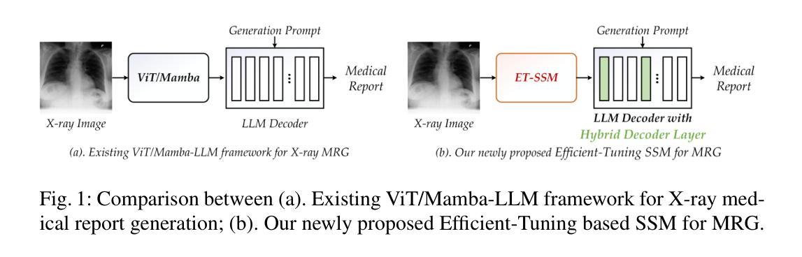 基于X射线的医学报告生成(MRG)是人工智能中的一个关键领域,可以显著降低医生的诊断负担和患者的等待时间。现有的MRG模型主要依赖大型语言模型(LLM)来改善报告生成,对预训练的视觉基础模型和高级微调技术的探索有限。主流框架要么避免微调,要么使用简单的如LoRA等方法,往往忽视了增强交叉注意力机制的潜力。虽然基于Transformer的模型在视觉语言任务中占主导地位,但对于医学报告生成来说,非Transformer架构,如Mamba网络,仍然被忽视,这为未来的研究提供了一个有前景的方向。在本文中,我们提出了EMRRG,这是一种新型的X射线报告生成框架,它使用参数有效的方法对预训练的Mamba网络进行微调。具体来说,X射线图像被分割成补丁,进行标记化,并通过SSM为基础的视觉主干进行特征提取,其中Partial LoRA取得了最佳性能。一个带有混合解码器的大型语言模型生成医学报告,实现了端到端的训练和在基准数据集上的强大表现。在三个广泛使用的基准数据集上进行的大量实验充分验证了我们为X射线MRG提出的策略的有效性。本文的源代码将在https://github.com/Event-AHU/Medical_Image_Analysis上发布。
