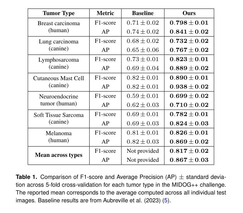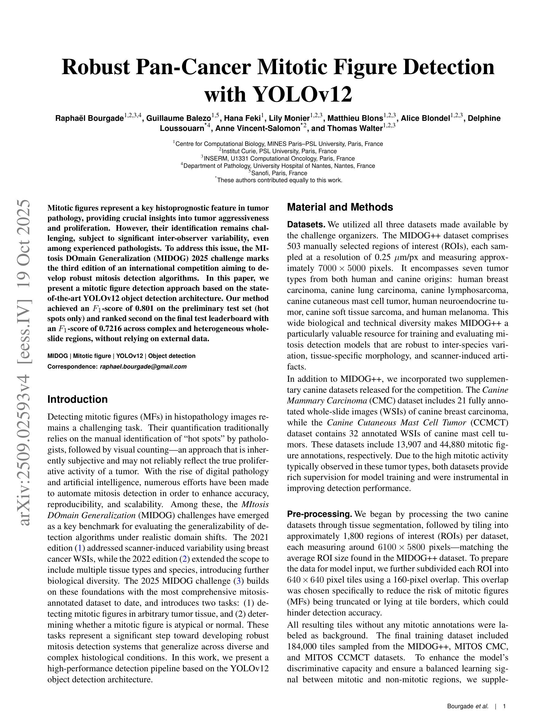 本文介绍了基于最新YOLOv12目标检测架构的肿瘤分裂象检测新方法,对于预测肿瘤侵袭性和增殖等关键预后因素具有重要意义。文章提到虽然病理学中识别分裂象仍是难点,但其仍是诊断关键信息的重要一环。因此,MIDOG挑战应运而生,旨在开发稳健的分裂象检测算法。本文提出的方案在初步测试集上的准确率为0.801(仅限于热点区域),并在最终测试排行榜上排名第二,其准确率为0.7216,即使面对复杂且异质的全幻灯片区域也无需依赖外部数据。这一发现有助于改善病理学家间因观察者差异造成的诊断不确定性问题。