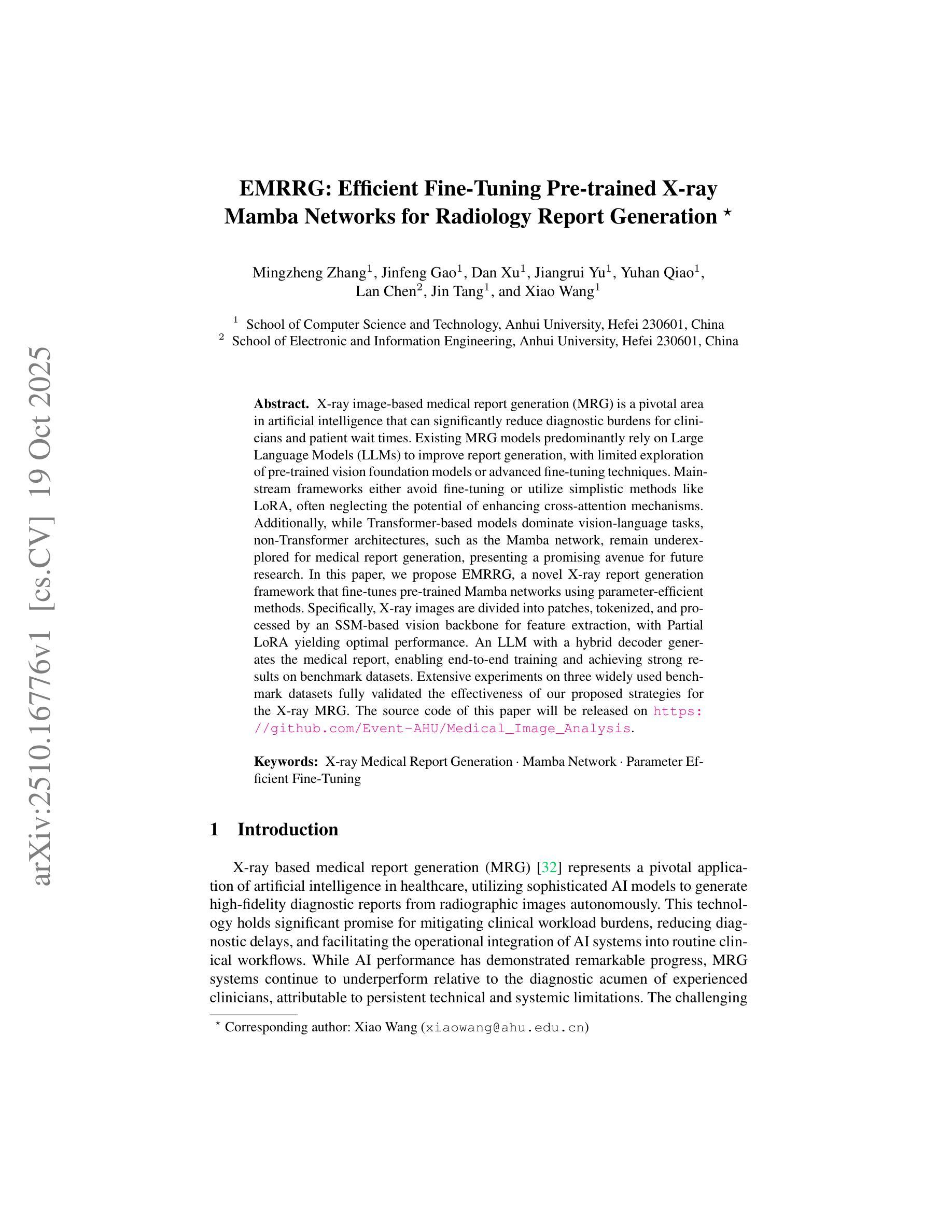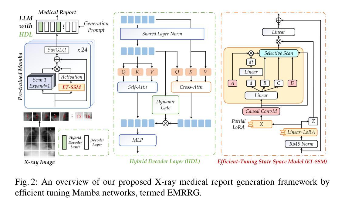 - 本文提出一种新型的X射线报告生成框架——EMRRG,结合参数高效微调方法和Mamba网络进行医学报告生成。