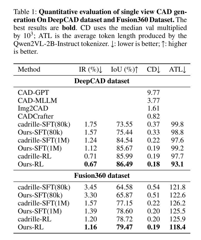 - 强化学习阶段引入的组长度奖励,在保持高几何保真度的同时,促进了更简洁的参数化建模序列的生成。