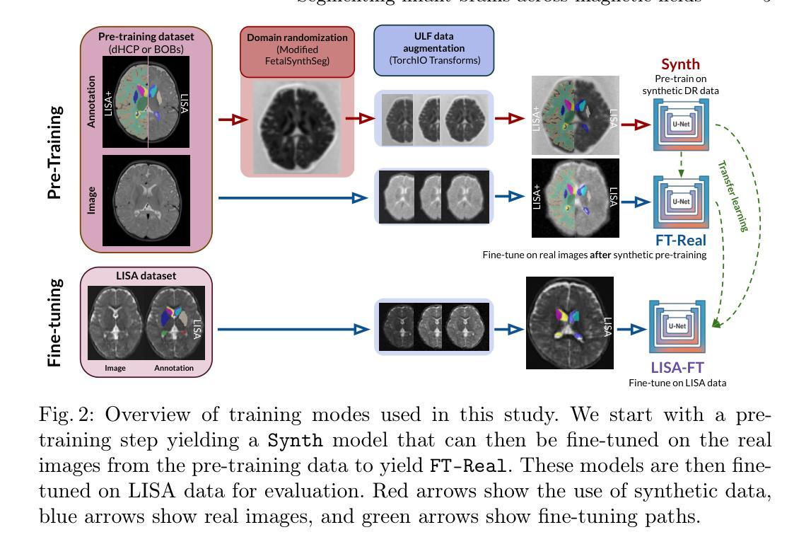 早期神经发育障碍的识别依赖于婴幼儿期脑结构的准确分割,这一任务因儿童大脑的快速生长、组织对比度差以及运动伪影而变得复杂。这些挑战在超低场(ULF,0.064~T)MRI中更为严重,尽管其图像质量较低,但它提供了经济实惠、便携且无需镇静的替代方案,适用于资源匮乏的环境。在这项工作中,我们提出了一个域随机化(DR)框架,以弥补高场(HF)和ULF MRI之间的域间隙差异,针对Lisa挑战中的海马体和基底神经节分割进行研究。我们证明了在全脑HF分割上使用DR进行预训练可显著提高对ULF数据的通用性,并且通过仔细筛选训练标签(从训练中剔除误注册的高频到超低场的注释),可以进一步提高性能。通过投票方式融合多个模型的预测结果,我们能够取得令人瞩目的表现。我们的结果表明,结合鲁棒的增强功能和注释质量控制能够在ULF数据中实现准确的分割。我们的代码可以在https://github.com/Medical-Image-Analysis-Laboratory/lisasegm找到。