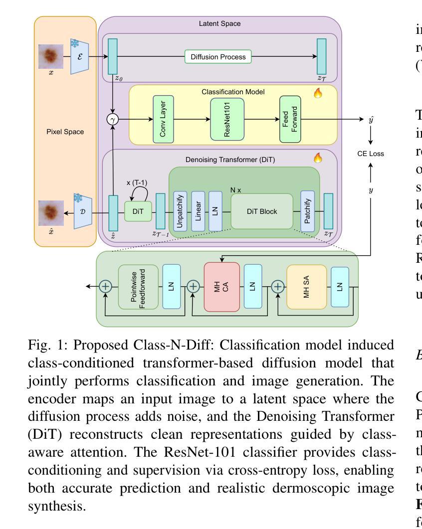 生成模型,尤其是扩散模型,已经显示出在生成高质量合成数据(包括医学图像)方面的显著能力。然而,传统的类别条件生成模型往往难以生成准确代表特定医学类别的图像,这限制了它们在皮肤癌诊断等应用中的实用性。为了解决这个问题,我们提出了一种分类诱导的扩散模型,即Class-N-Diff模型,可以同时生成和分类皮肤镜图像。我们的Class-N-Diff模型在扩散模型内部集成了一个分类器,根据类别条件指导图像生成。因此,该模型对类别条件图像合成的控制更好,能够生成更真实、更多样的图像。此外,分类器还展示了其改进的性能,凸显其在下游诊断任务中的有效性。这种独特的集成在我们的Class-N-Diff模型中使其成为提高基于扩散模型的合成皮肤镜图像生成质量和实用性的强大工具。我们的代码可通过https://github.com/Munia03/Class-N-Diff获取。