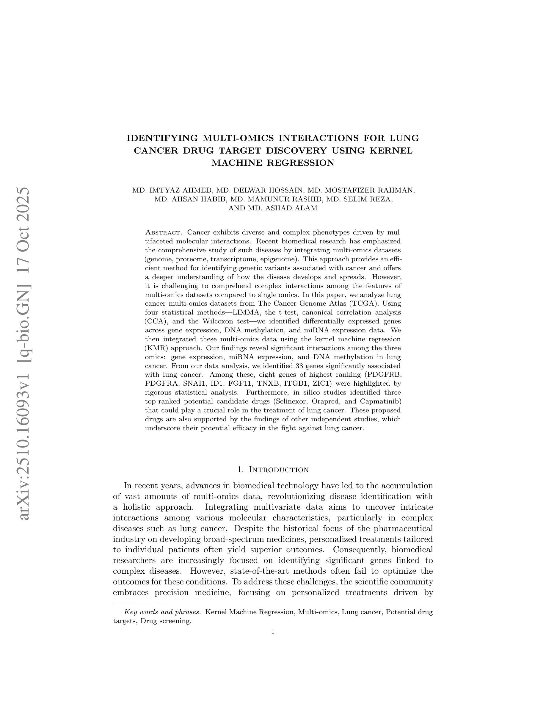 癌症表现出多样且复杂的表现型,其背后由多层面的分子交互驱动。近期的生物医学研究强调了通过整合多组学数据集(基因组、蛋白质组、转录组和表观基因组)来对这类疾病进行全面研究的重要性。这种方法为识别与癌症相关的遗传变异提供了一种高效方法,并提供了对疾病发展和扩散的更深层次理解。然而,与单组学相比,理解多组学数据特征之间的复杂交互是一项挑战。在本文中,我们分析了来自癌症基因组图谱(TCGA)的肺癌多组学数据集。我们使用四种统计方法(LIMMA、T检验、典型相关分析(CCA)和Wilcoxon检验)来识别基因表达、DNA甲基化和miRNA表达数据中的差异表达基因。然后,我们使用核机器回归(KMR)方法整合这些多组学数据。我们的研究发现,基因表达、miRNA表达和DNA甲基化三者之间存在显著的交互作用。通过我们的数据分析,我们鉴定了与肺癌显著相关的38个基因。其中,排名最高的8个基因(PDGFRB、PDGFRA、SNAI1、ID1、FGF11、TNXB、ITGB1、ZIC1)经过严格的统计分析被突出显示。此外,计算机模拟研究确定了三种排名最高的潜在候选药物(Selinexor、Orapred和Capmatinib),这些药物在肺癌的治疗中可能发挥关键作用。这些提议的药物也得到了其他独立研究的支持,这强调了它们在抗击肺癌中的潜在疗效。