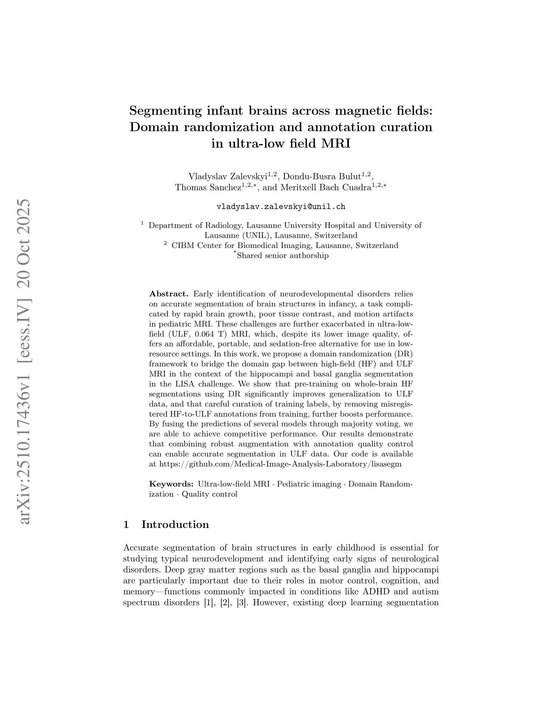 本文关注早期神经发育障碍的准确诊断,尤其是在低资源环境中。研究中提出一种基于领域随机化(DR)的框架,旨在缩小高场(HF)和超低频(ULF)MRI在脑结构分割方面的差距。通过预训练全脑HF分割并采用DR技术,模型在ULF数据上的泛化能力显著提高。同时,对训练标签进行仔细筛选,去除误注册的高频至低频标注,进一步提升性能。通过融合多个模型的预测结果,实现具有竞争力的表现。该研究结合了鲁棒增强与标注质量控制,使得ULF数据的精准分割成为可能。